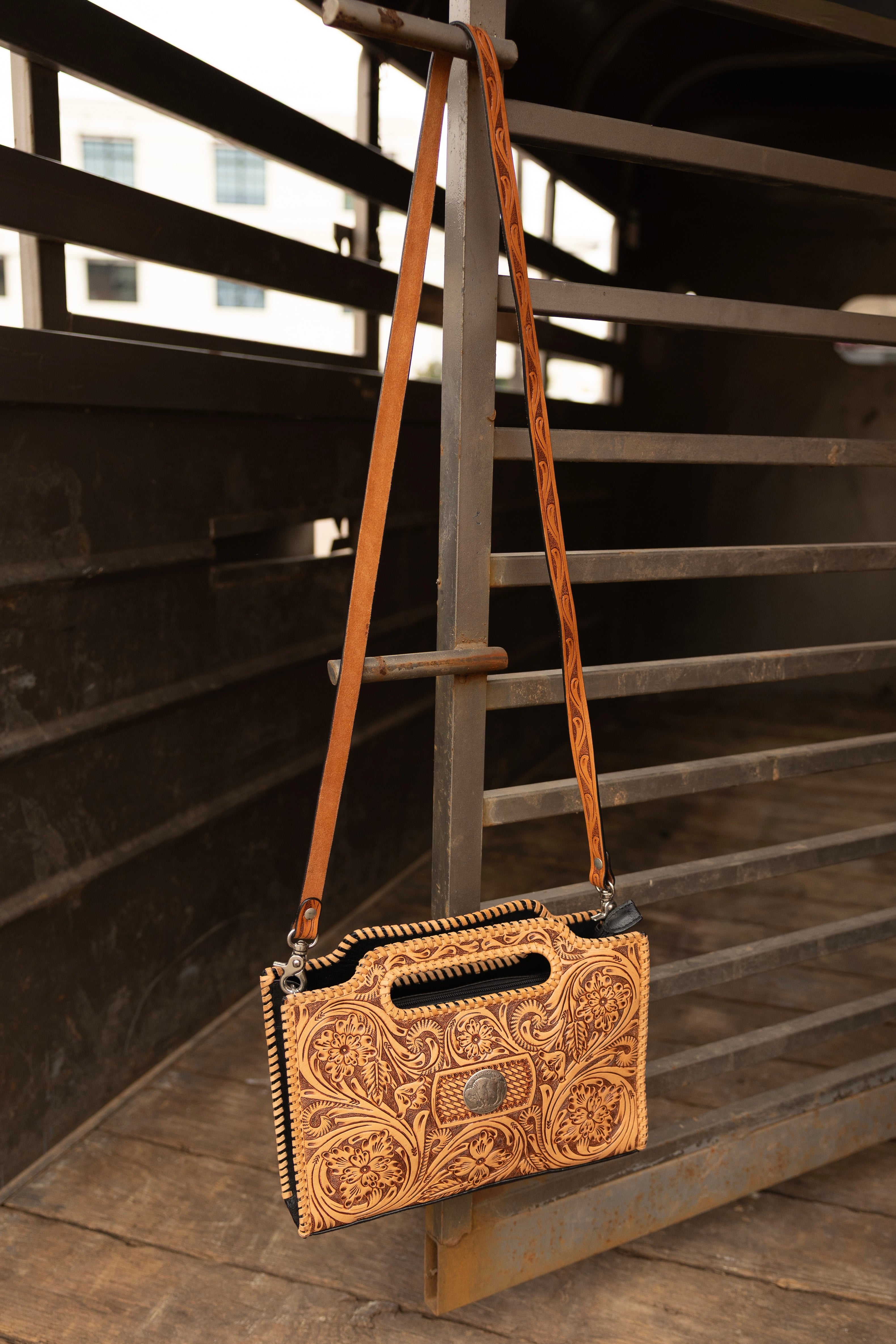Crafted deep in the heart of Texas, this genuine leather hand-tooled clutch is a work of art you can carry. Every inch is packed with intricate western detail, made by skilled hands that know their way around a good piece of hide. Rock it as a clutch for a night out or clip on the optional strap to wear it crossbody when you’re on the move. Rustic, refined, and made to last a lifetime — just like a good pair of b