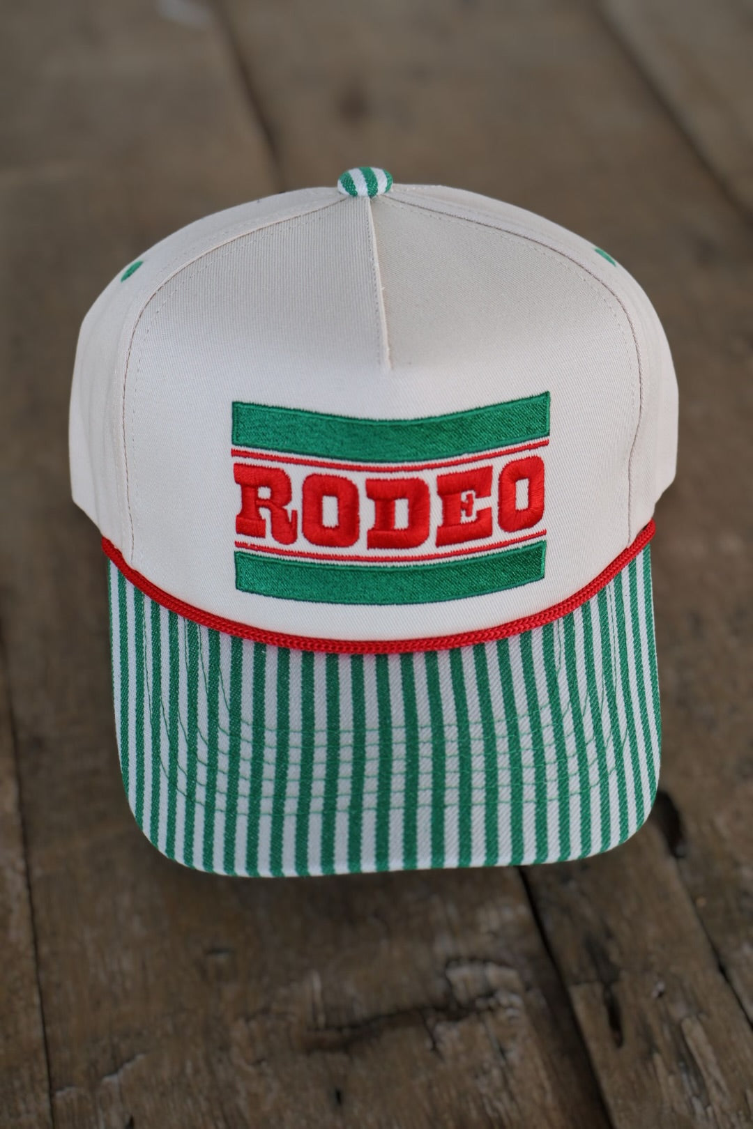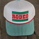 The Rodeo Stripe Trucker features bold western lettering, vintage-inspired stripes, and a classic foam trucker fit. The green striped bill gives it just the right amount of punch while still pairing effortlessly with denim, basics, and your favorite wild rag.