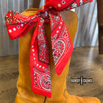 The Texas Tango Twillie brings fiery western flair in a bold, eye-catching package. This silky red twillie features a playful bandana-inspired print with hearts, florals, and classic paisley elements- perfect for adding a little sass and color to any outfit. Its lightweight feel and narrow shape make it easy to tie around your neck, hat, wrist, or bag.