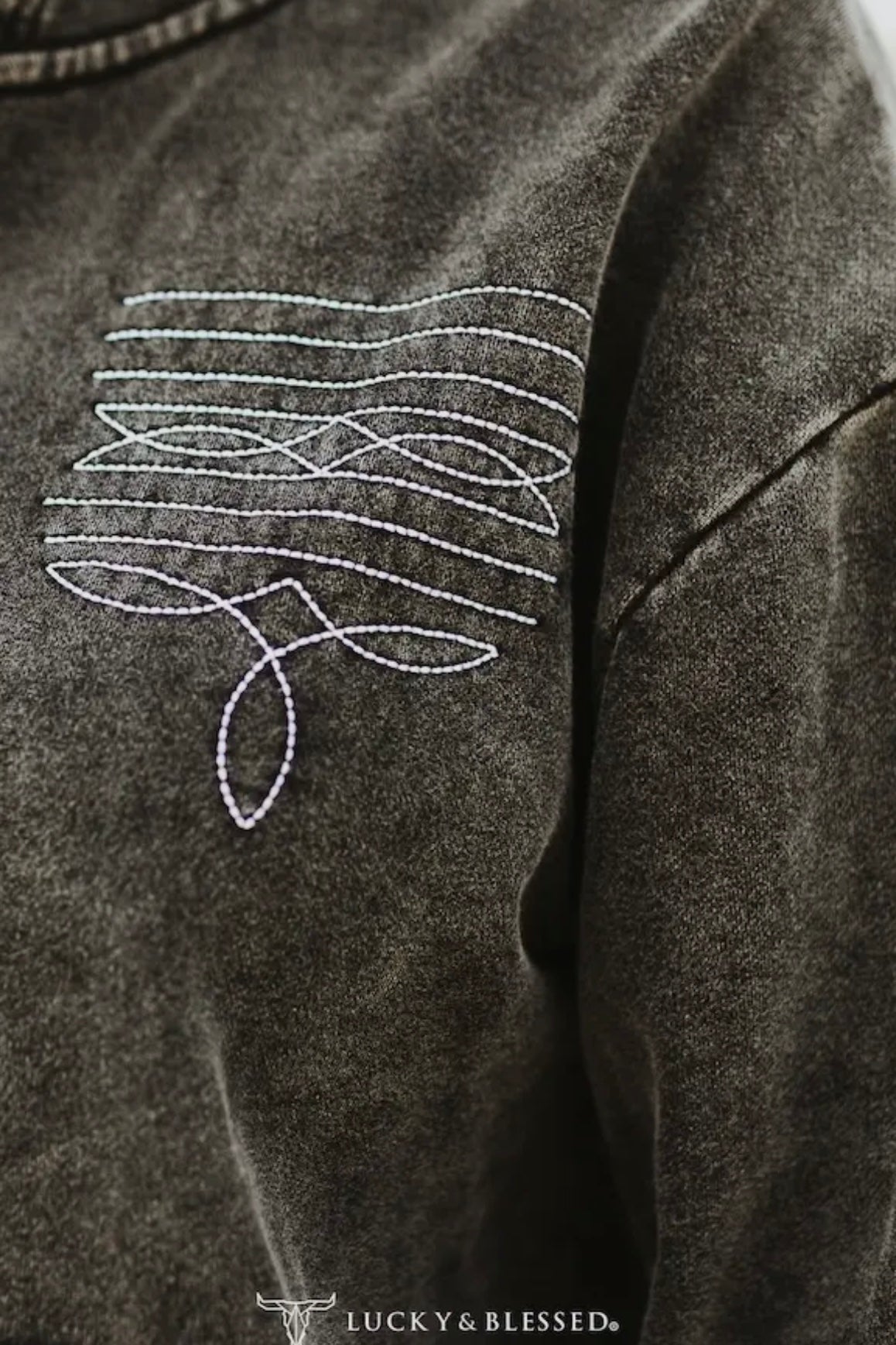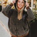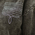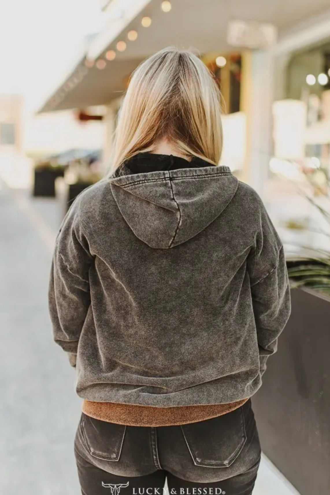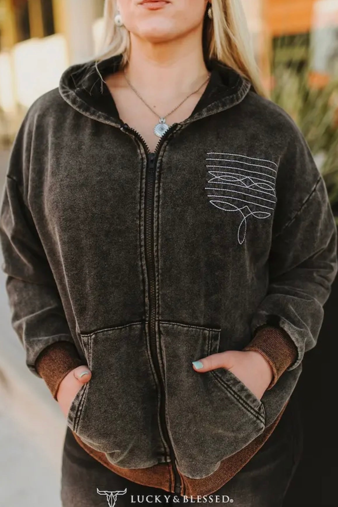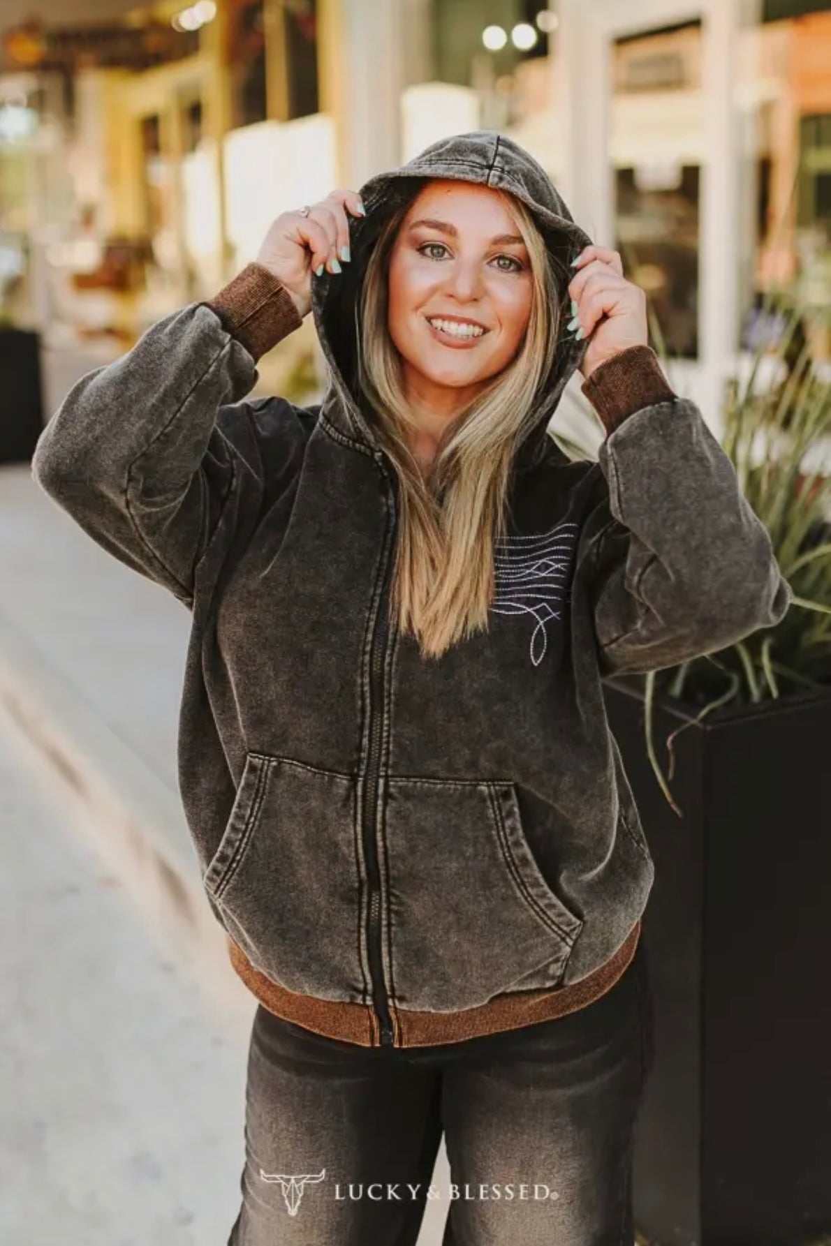 Stay cozy with Western grit in the Dust Storm Zip Hoodie. This mineral-washed black fleece hoodie delivers that worn-in, vintage workwear feel with a relaxed silhouette and rugged charm. Designed with ribbed brown cuffs and waistband for a contrast finish, plus oversized kangaroo pockets for practicality, it’s made for rodeo weekends, chilly barn nights, or casual days in town. The stitched rope embroidery on the chest nods to Western roots while keeping the look modern and versatile. Zip it up with jeans and boots, or layer over a tee for easy, everyday cowgirl style.