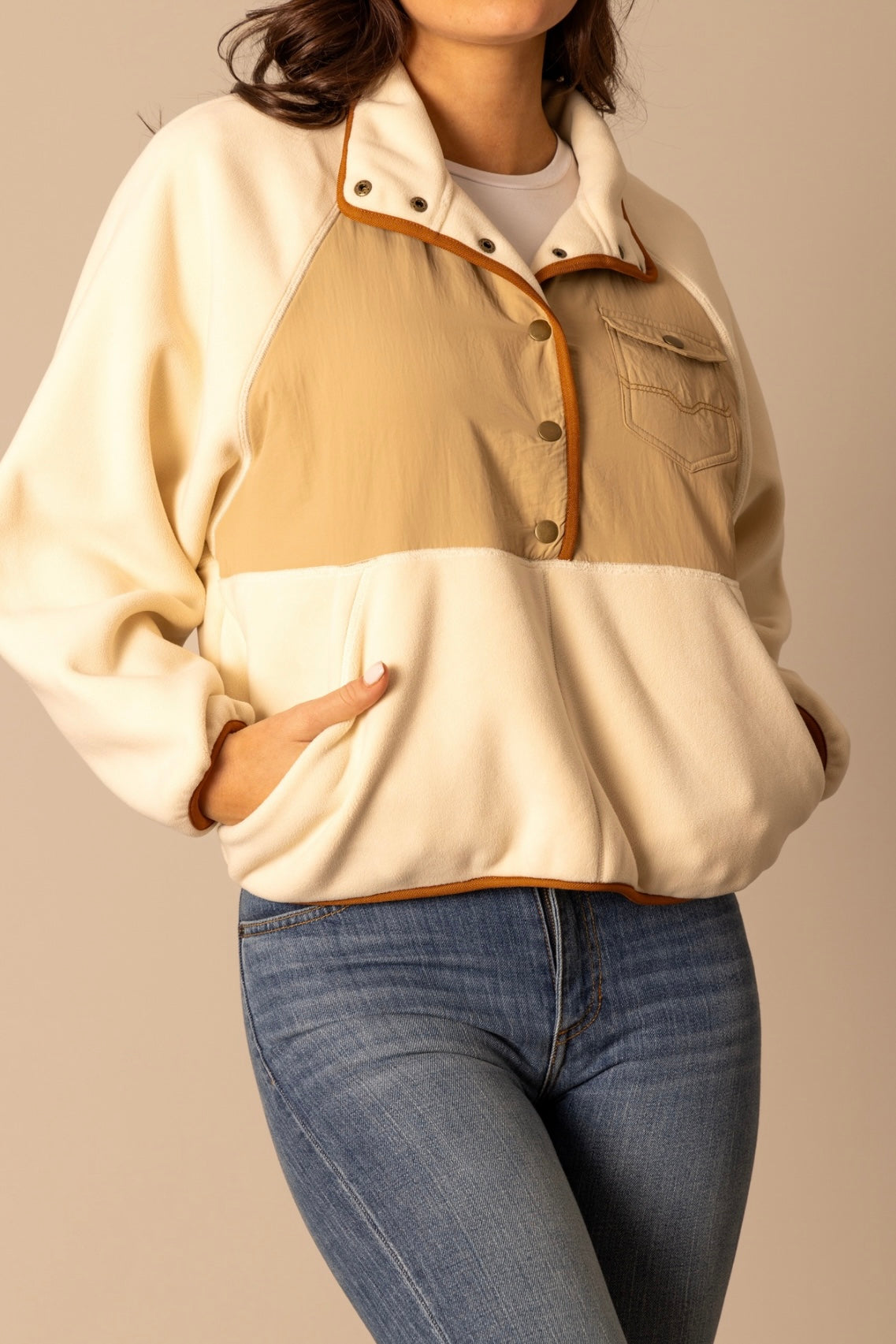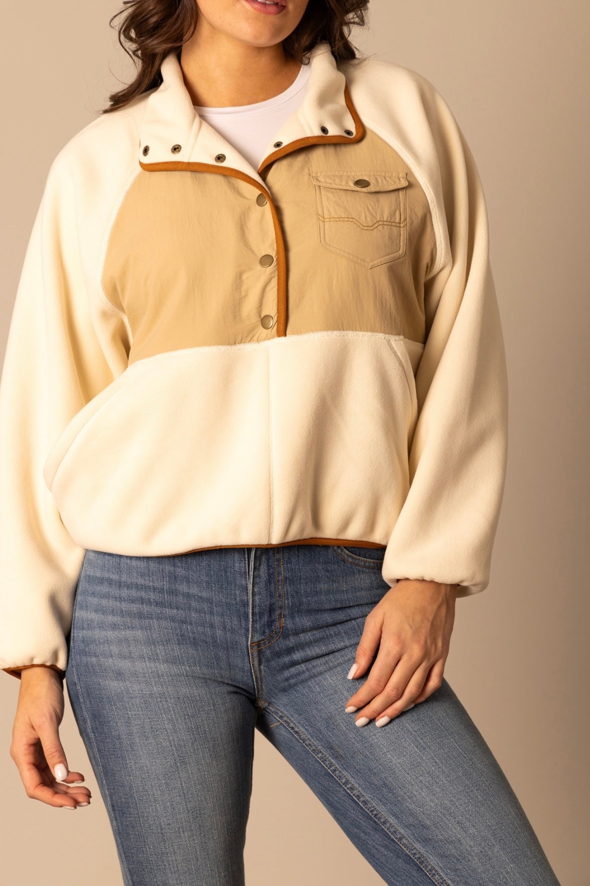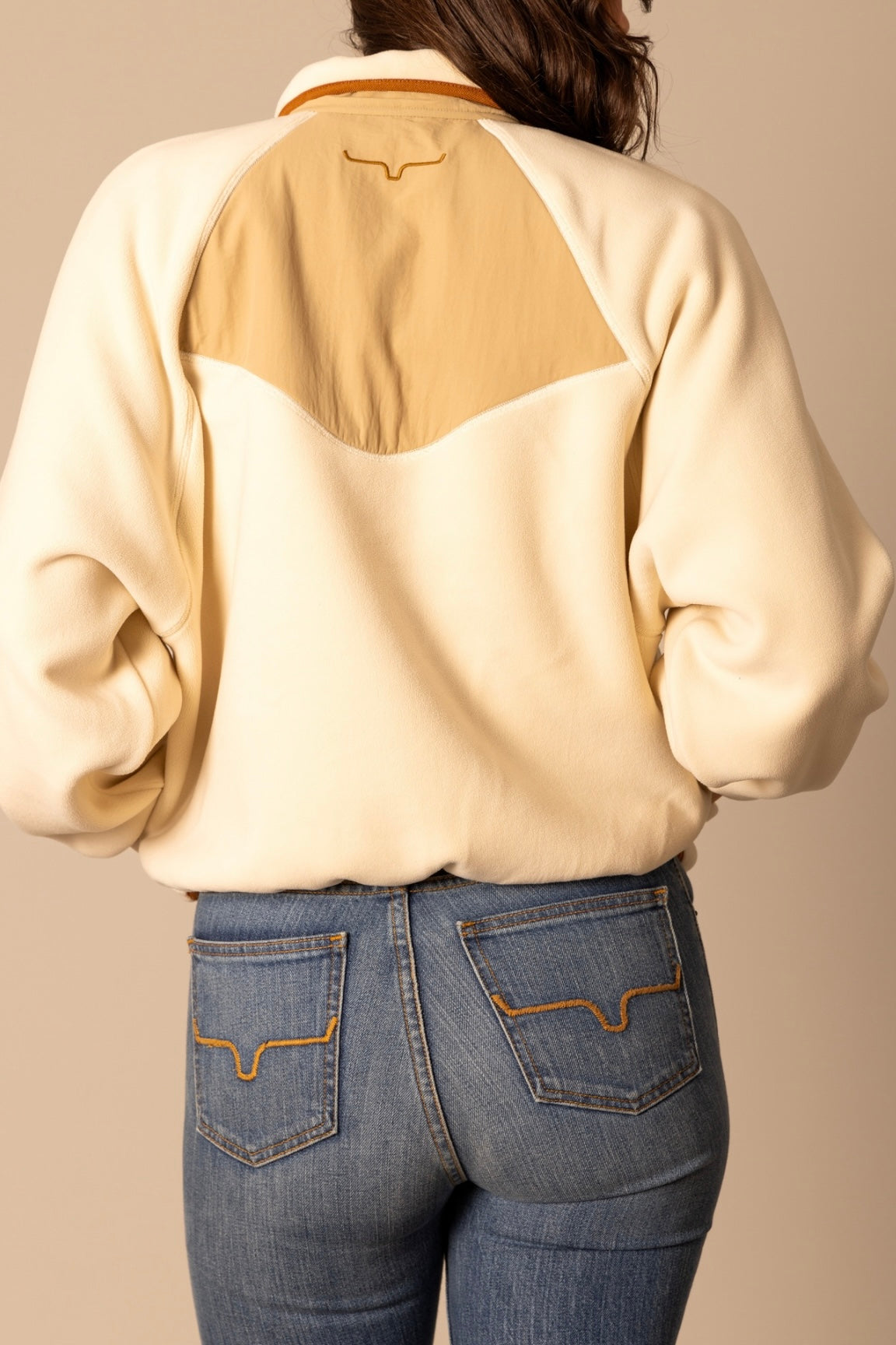 The Josie Fleece is a relaxed and refined polar fleece jacket made for chilly days. Featuring a bold colorblocked yoke and front panel, this cozy layer adds a pop of western style to any outfit. The four-button placket and high collar offer adjustable warmth, while the snap-button chest pocket with the embroidered Longhorn logo adds both function and flair. Finished with durable Taslan trim at the seams, the Josie combines practicality, comfort, and Kimes Ranch signature style.