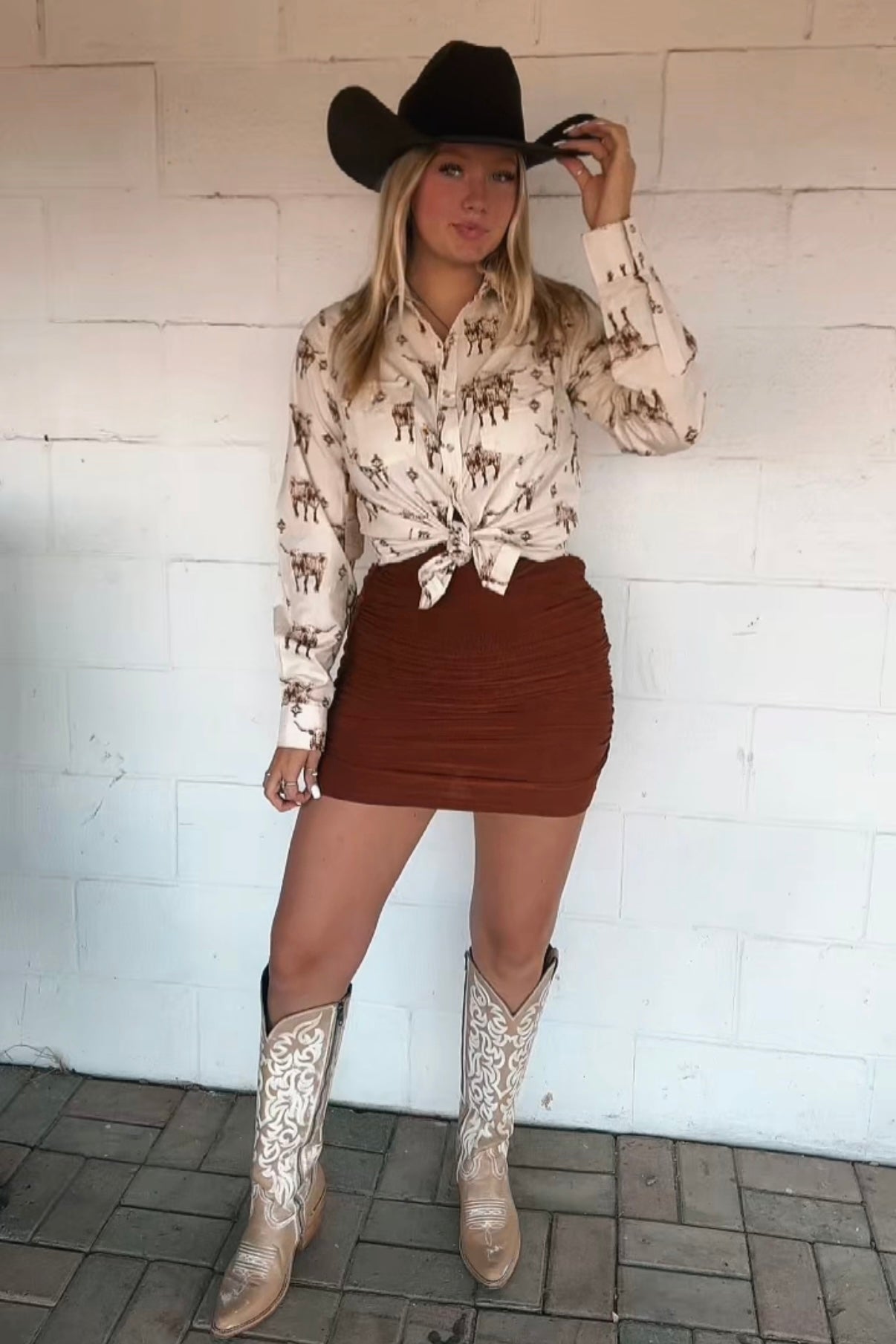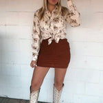 Game day just got a whole lot cooler. The Hook ’Em Pearl Snap is a Western twist on tailgate style, featuring a cream base with rust-toned longhorns and desert diamond prints. With classic pearl snap buttons and a flattering fit, this shirt was made for Saturdays in Austin, honky-tonk nights, and every fall plan in between. Available in extended sizes, because every cowgirl deserves a standout shirt for the season.