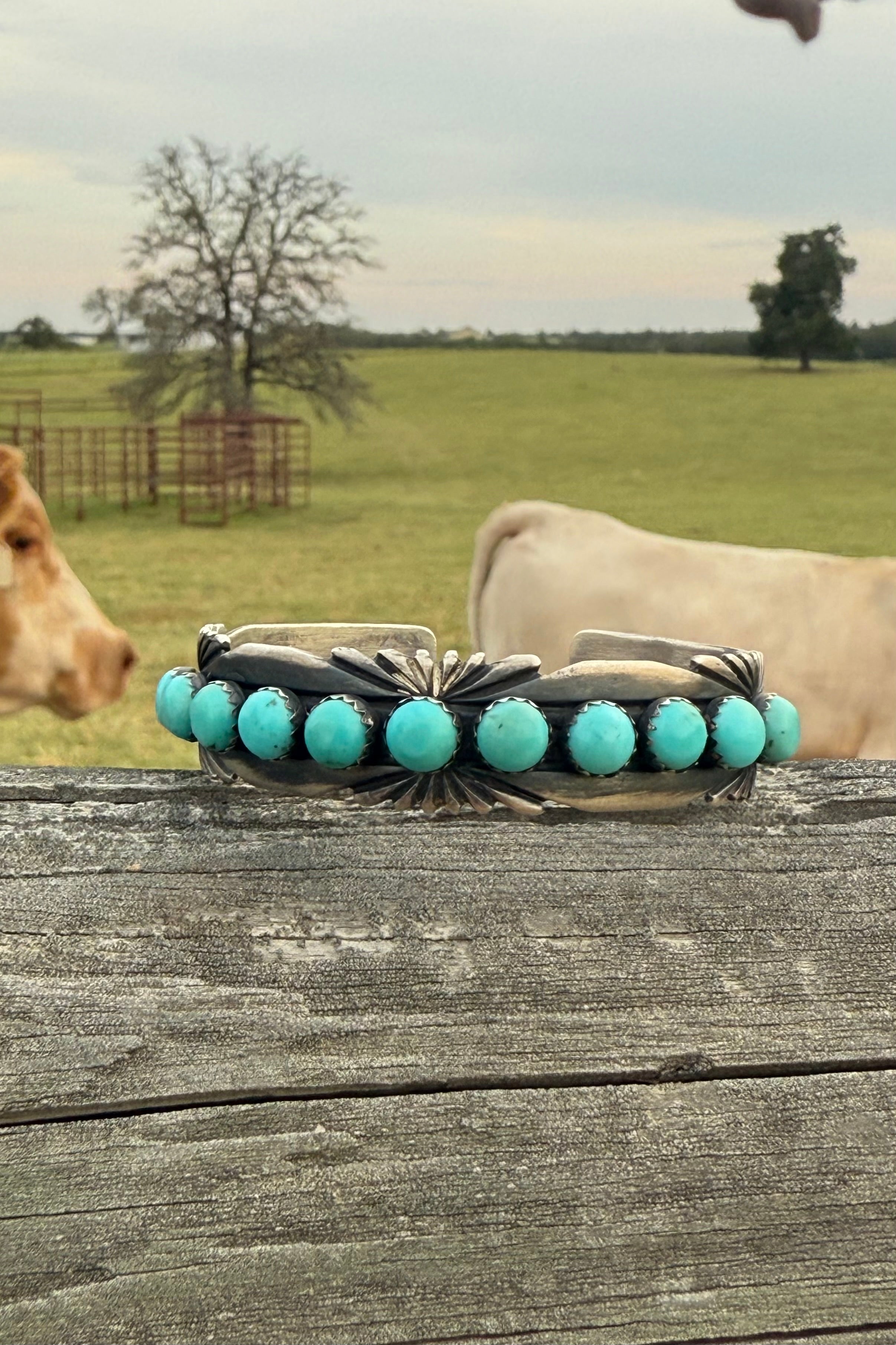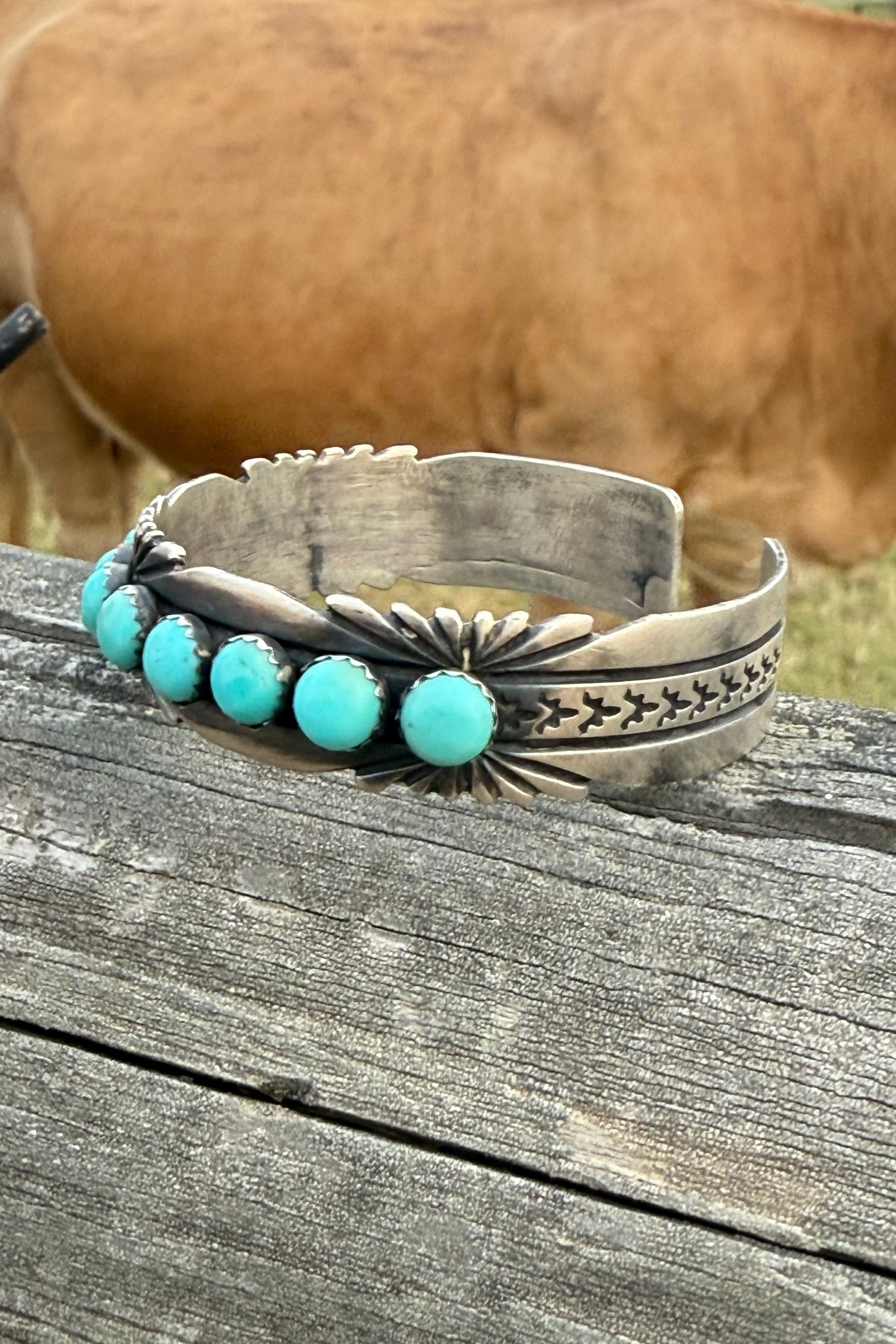 This genuine Native American cuff bracelet is a stunning celebration of tradition and craftsmanship. Handcrafted from sterling silver, it features a row of vivid turquoise stones, each expertly set and framed by intricate silverwork. The fine stamped detailing adds depth and artistry, making this piece a standout on its own or stacked with others.