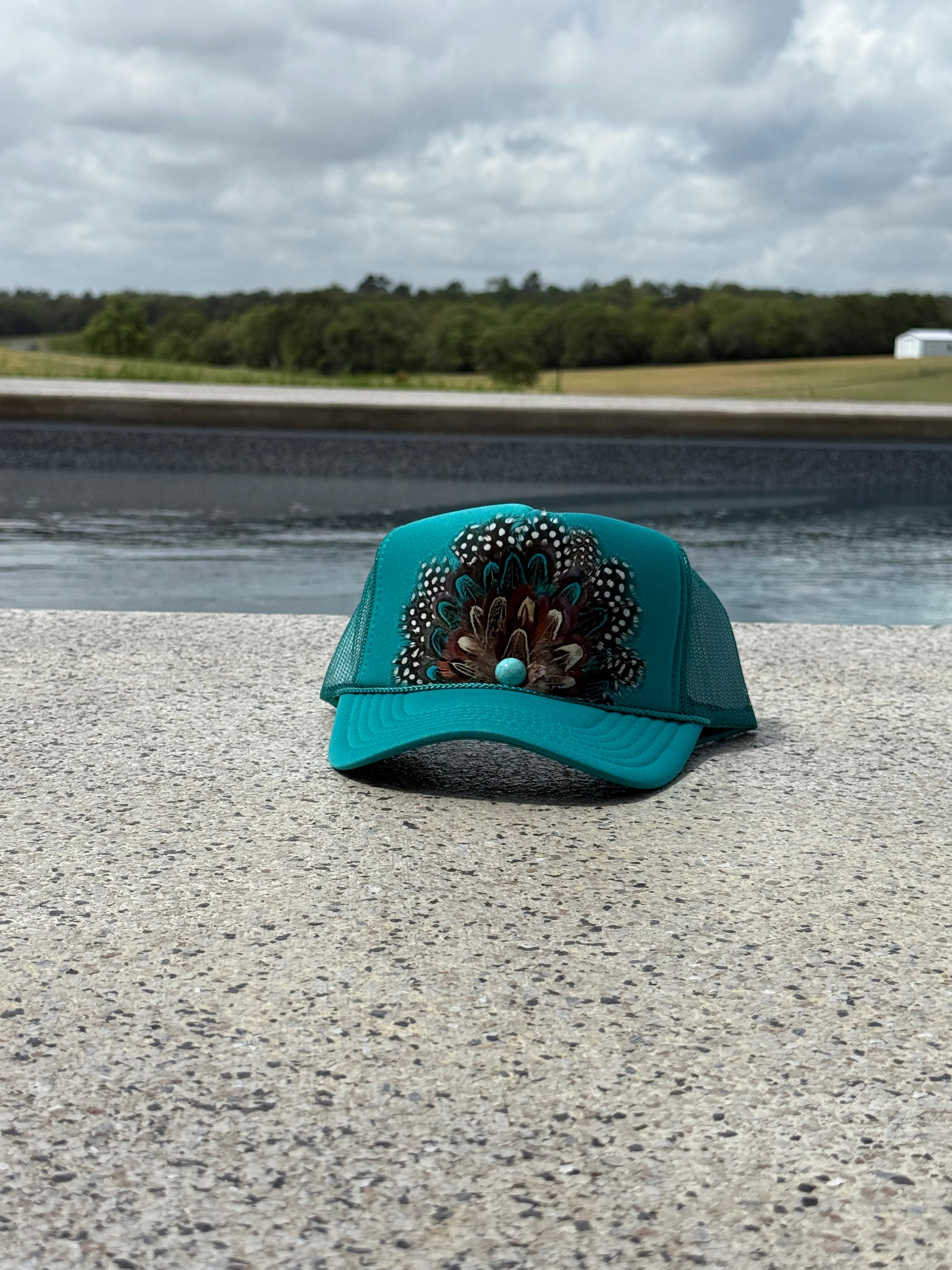 A classic trucker silhouette with a bold Western edge. The Teal Feather Trucker features a detailed feather appliqué with turquoise accents that pops against a deep black base. Equal parts statement and staple — this one finishes an outfit without trying too hard.
