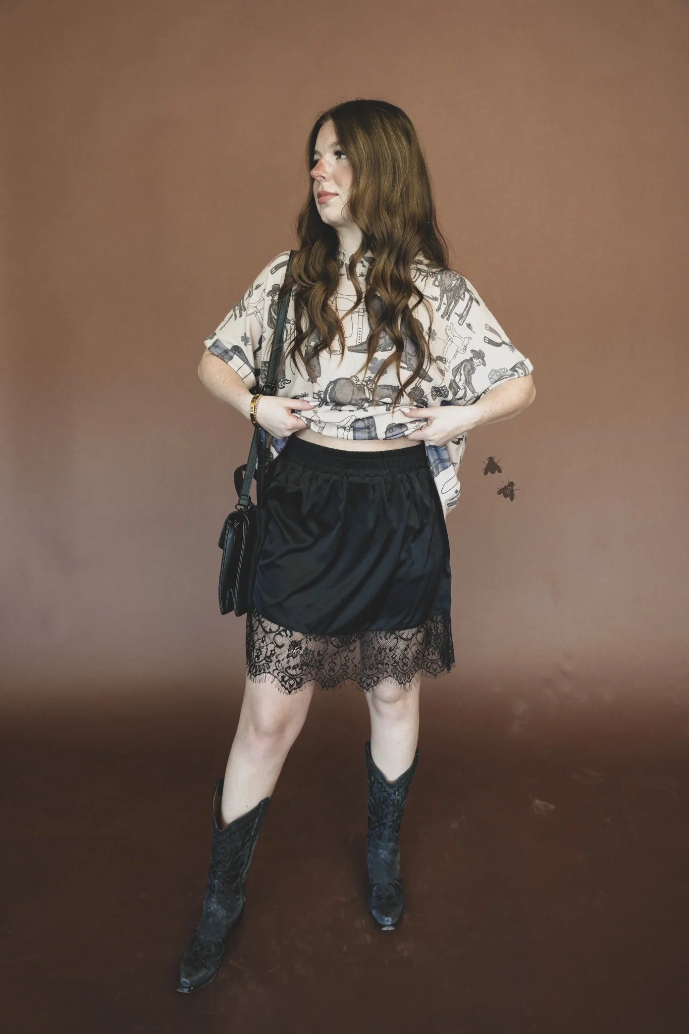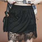 The piece you reach for when the night’s not quite over. The Last Call Lace Slip Skirt features a soft satin finish with a delicate lace hem that adds just enough romance. Designed to layer effortlessly under oversized graphic tees and sweaters, or styled on its own with a belt and boots for a late-night look. Easy, feminine, and made for outfit repeaters.