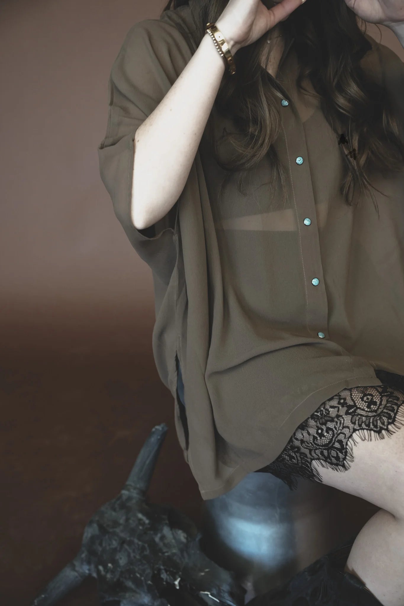 Soft, sheer, and made for after-dark moments. The Marfa Nights Sheer Blouse features a relaxed, flowy silhouette with subtle turquoise button details that add just enough Western edge.