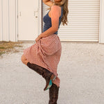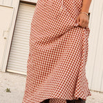 Crafted in a rose mauve gingham, it feels equally at home styled as a set or paired with a simple tank or knit. Feminine, nostalgic, and endlessly wearable, this skirt brings cottage charm to everyday spring dressing.