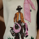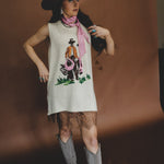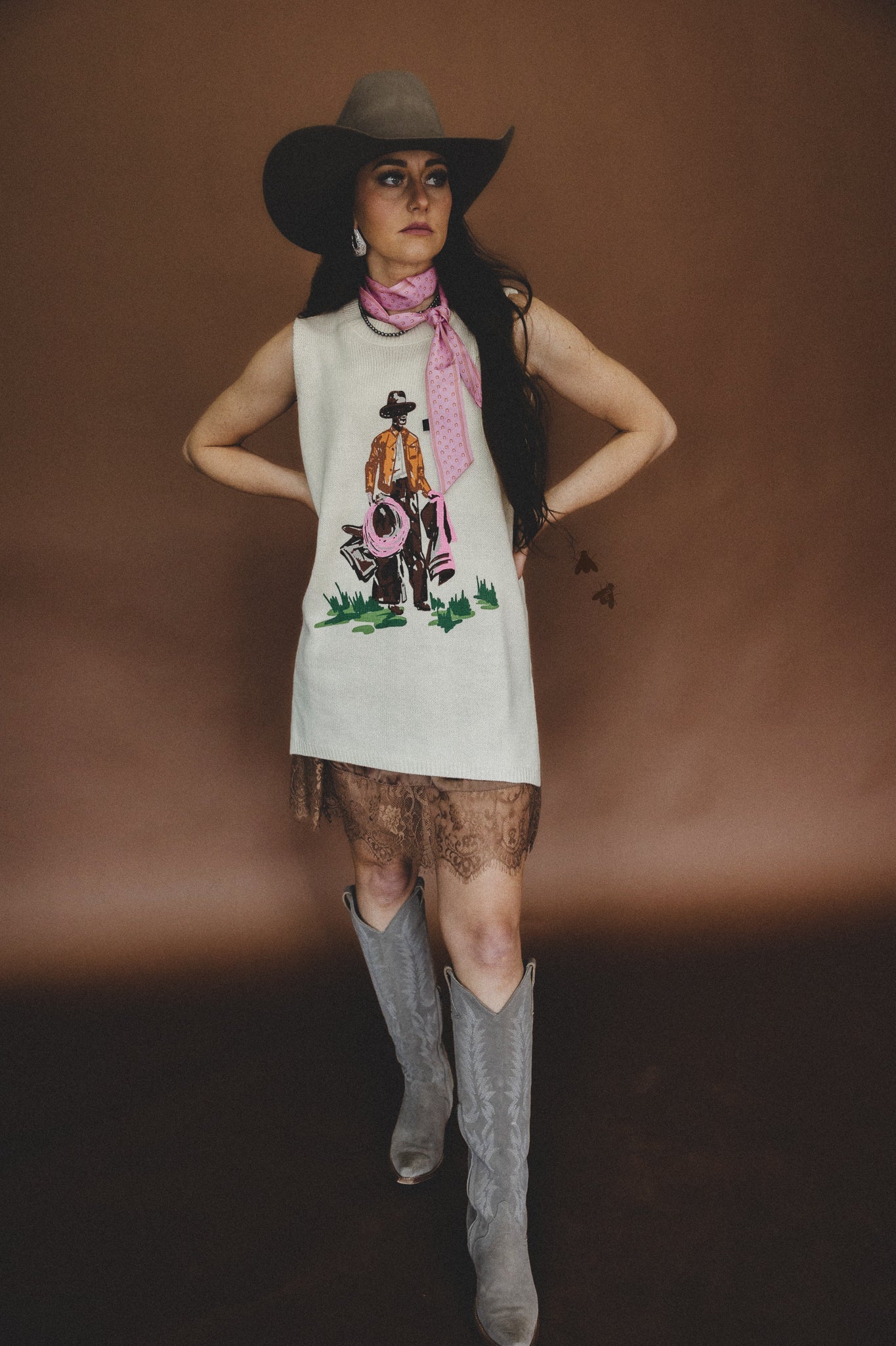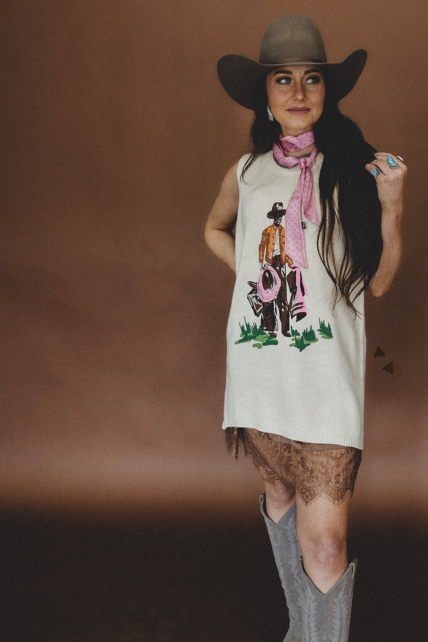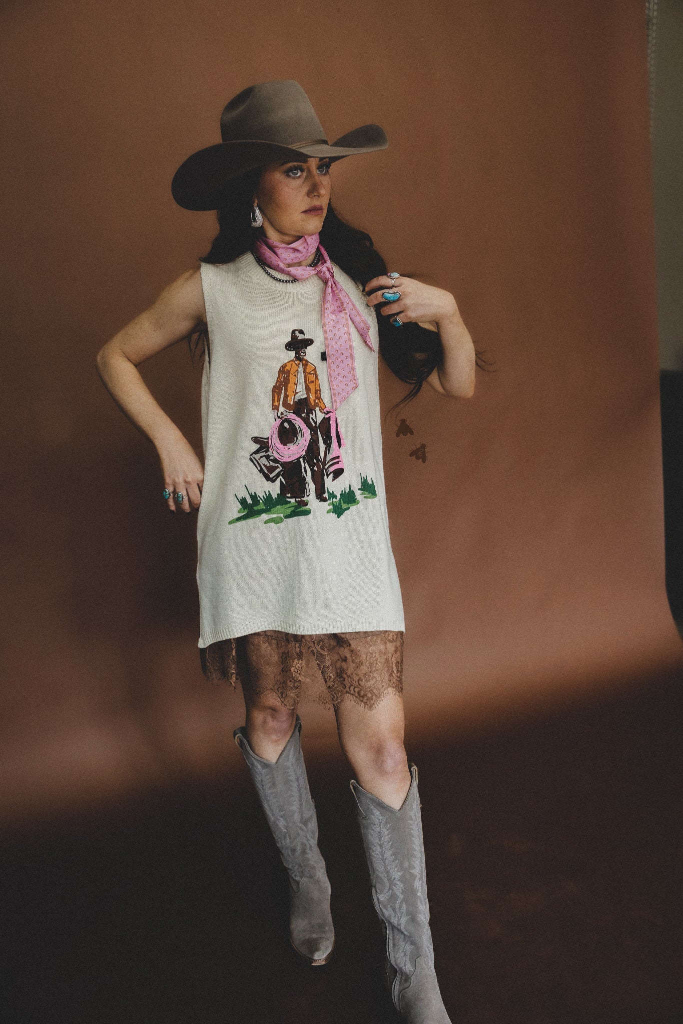 The Rosy Outlaw Knit Tank Tunic brings together classic Western graphics with a feminine edge. Featuring a vintage-inspired cowboy print with subtle pink accents, this lightweight knit was made to stand out while still feeling easy.