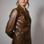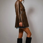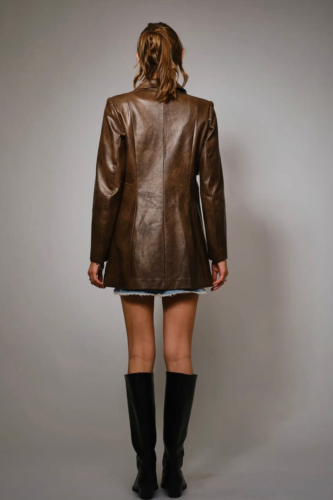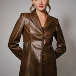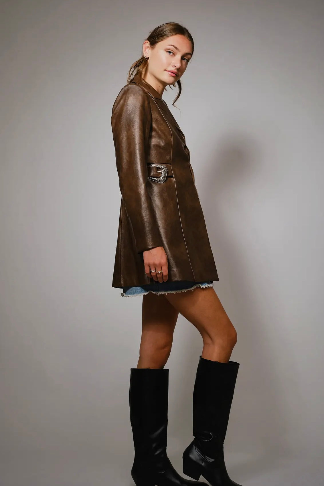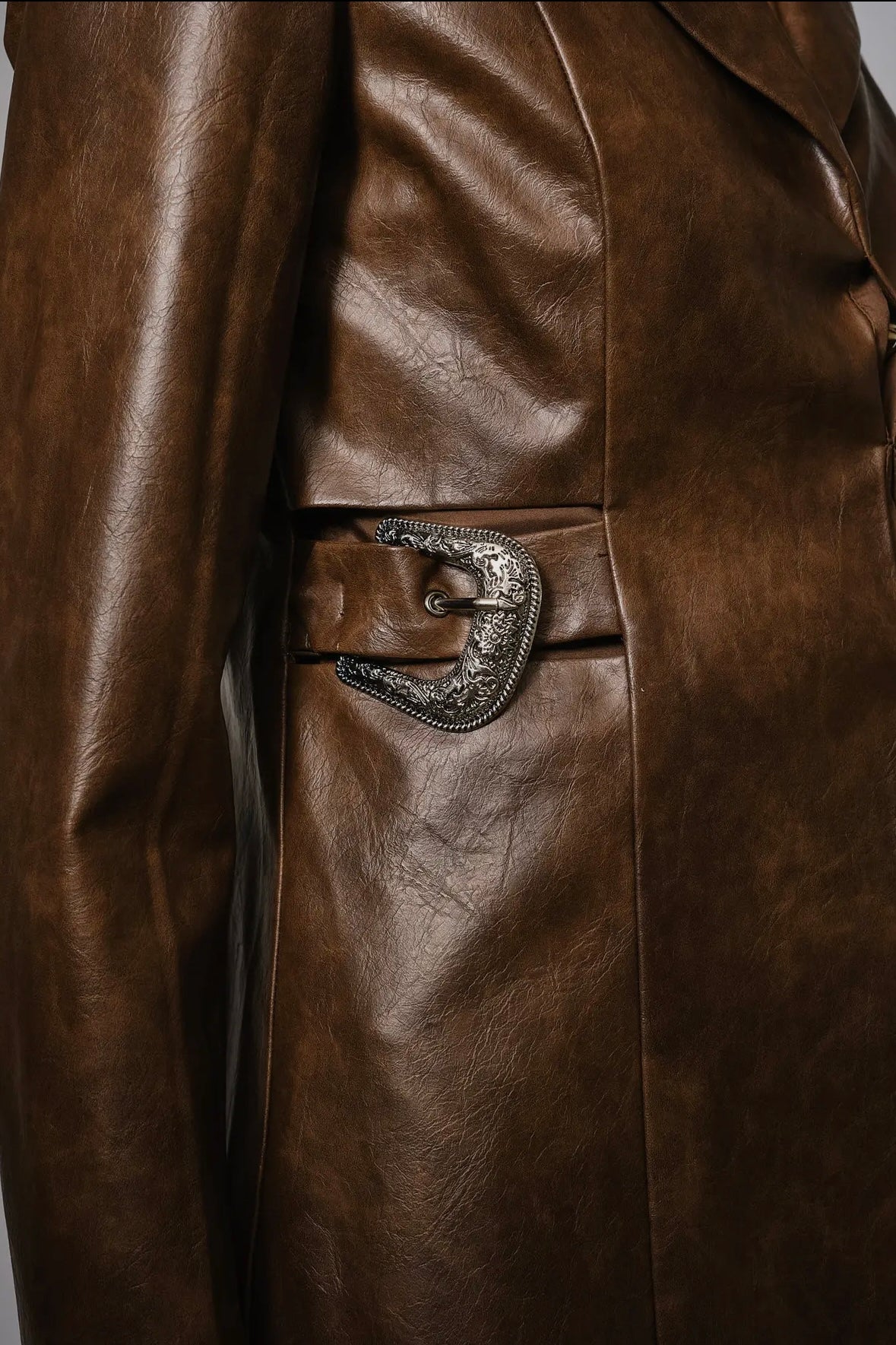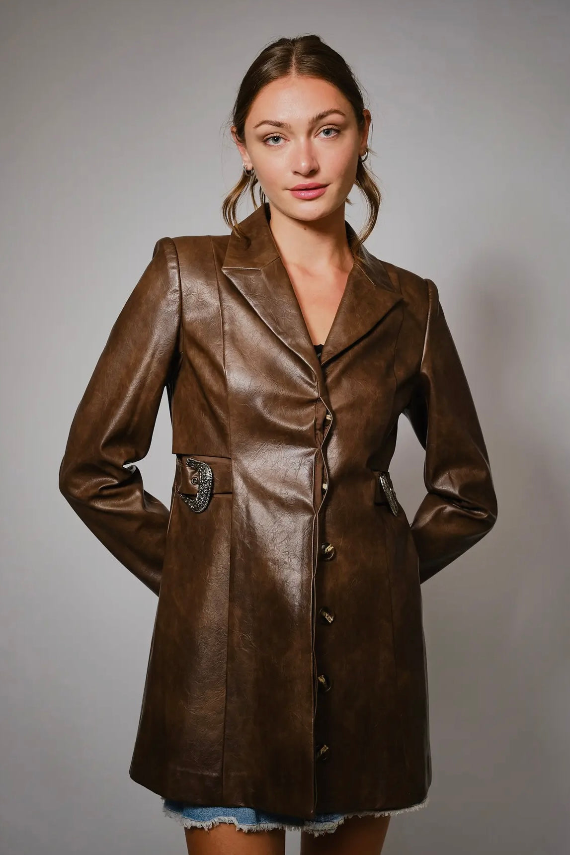 The Cattleman’s Daughter Blazer blends boss-babe polish with unapologetic Western edge. Designed in a longline silhouette, this structured blazer is crafted in dark brown faux leather and detailed with engraved silver western buckles at the waist — a nod to heritage style with a modern, high-stakes twist.