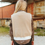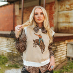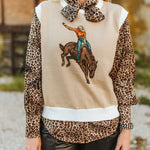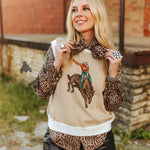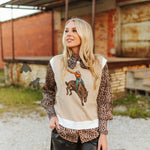 Western—but make it luxe. The A Million Bucks Sweater Vest turns a rodeo classic into a polished statement piece with its bronc rider graphic and neutral bone-and-tan palette. Designed with the same flattering, boxy fit as our Retro Ranch vest, this one layers effortlessly over prints like the Willow Wild Leopard Top or a crisp white button-up.