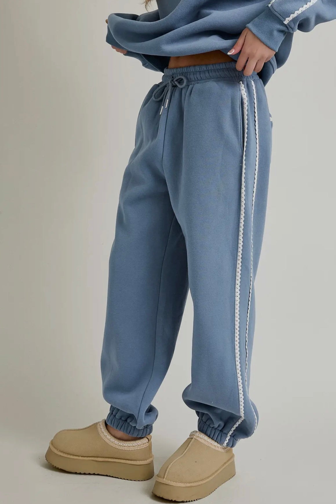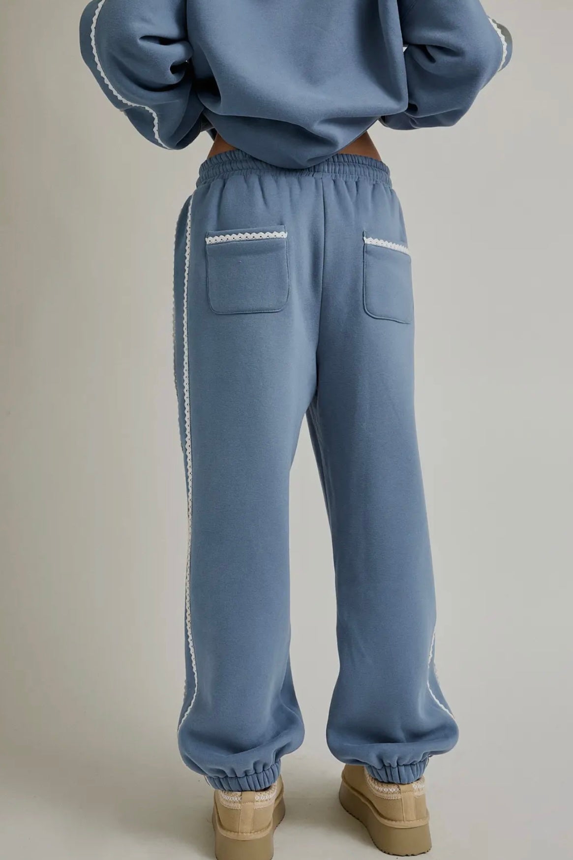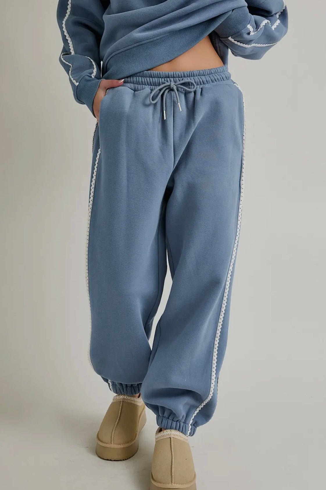 Meet your new off-duty essential — the Bluebird Lane Joggers. Designed in a soft periwinkle-blue fleece, they feature a relaxed fit with an adjustable drawstring waist, cuffed hems, and scalloped white trim down each leg for a feminine touch.