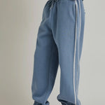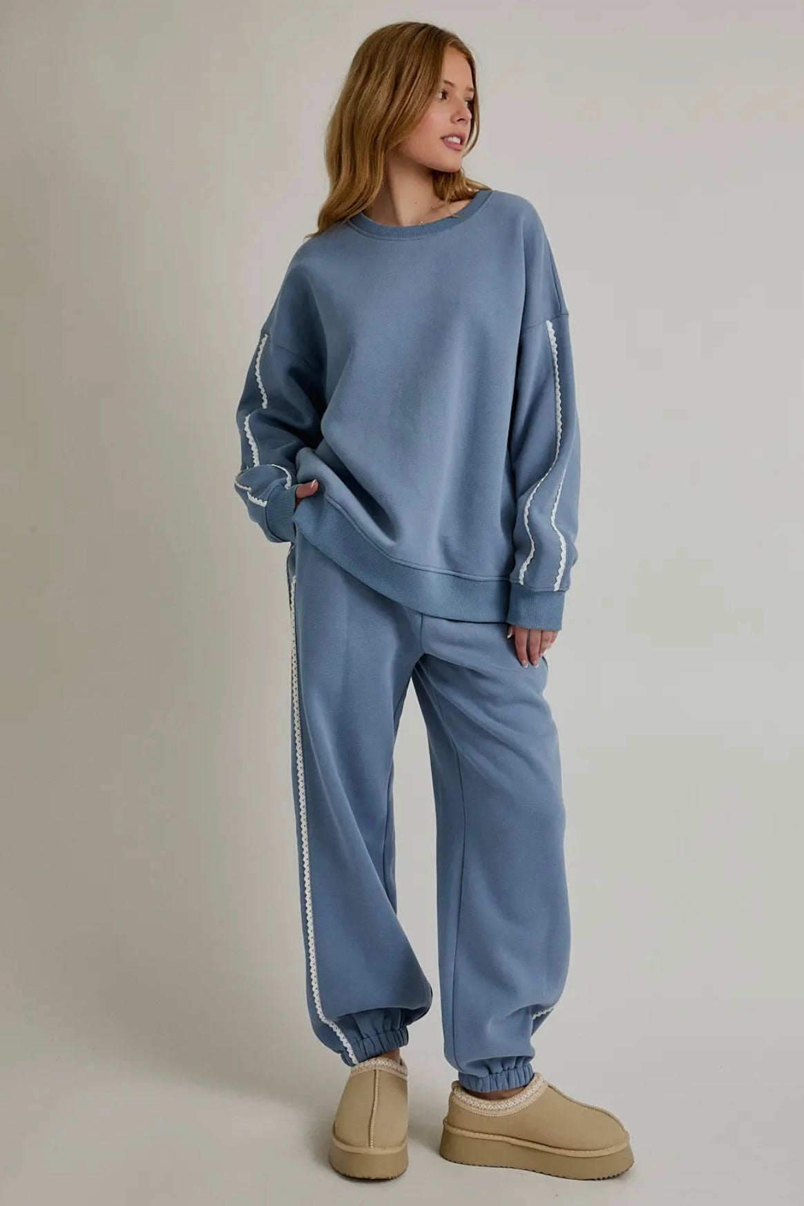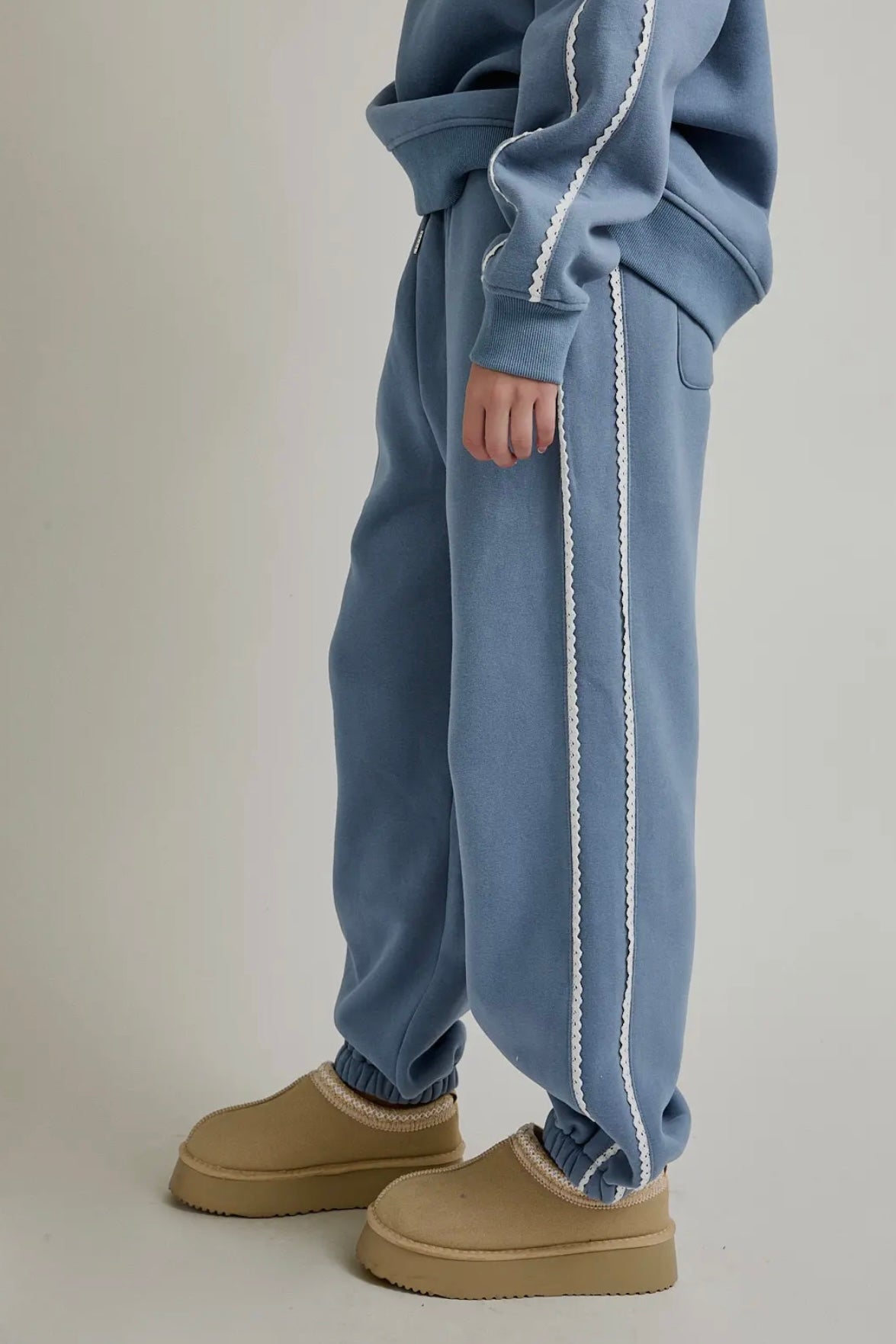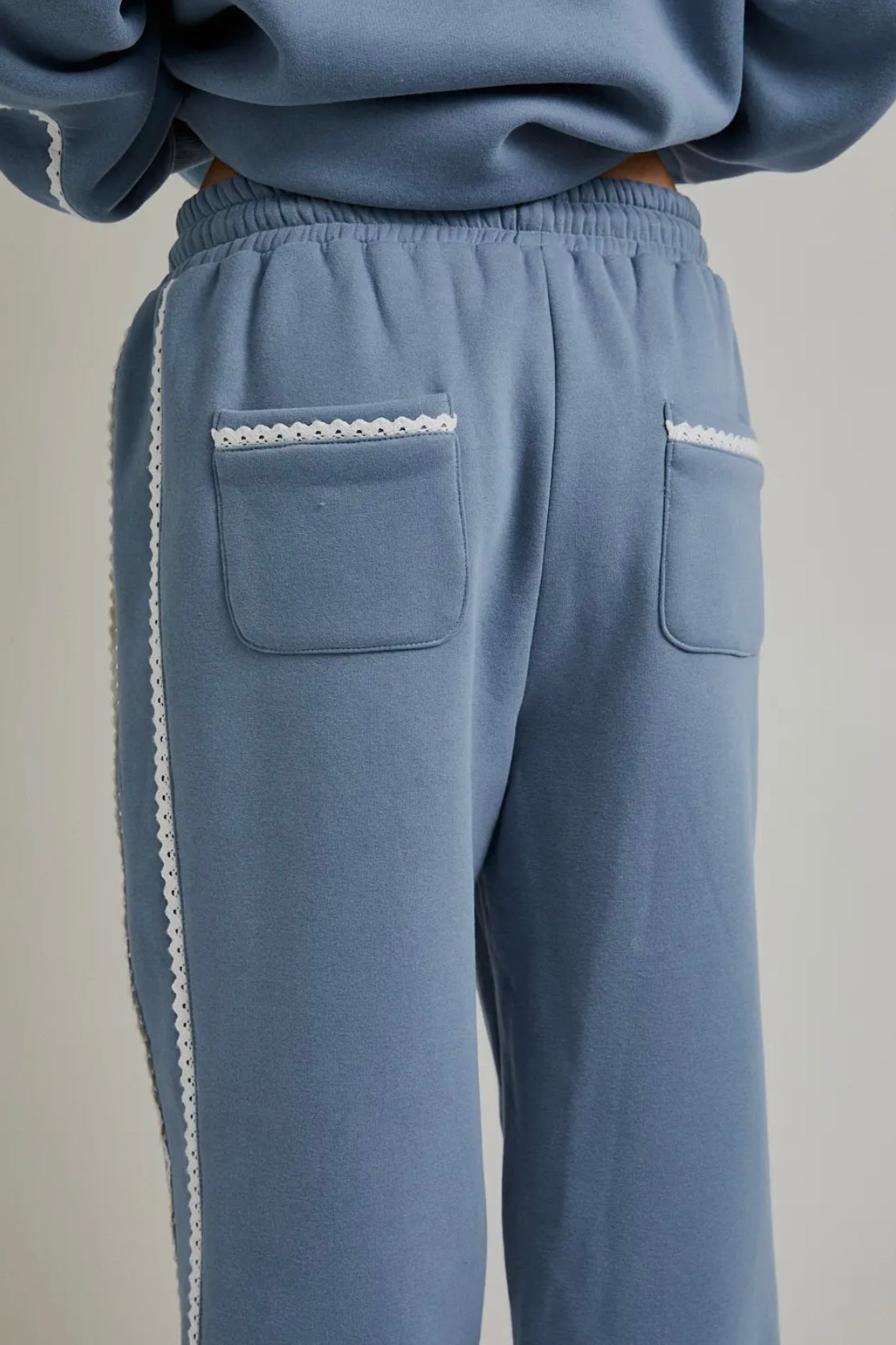 Meet your new off-duty essential — the Bluebird Lane Joggers. Designed in a soft periwinkle-blue fleece, they feature a relaxed fit with an adjustable drawstring waist, cuffed hems, and scalloped white trim down each leg for a feminine touch.
