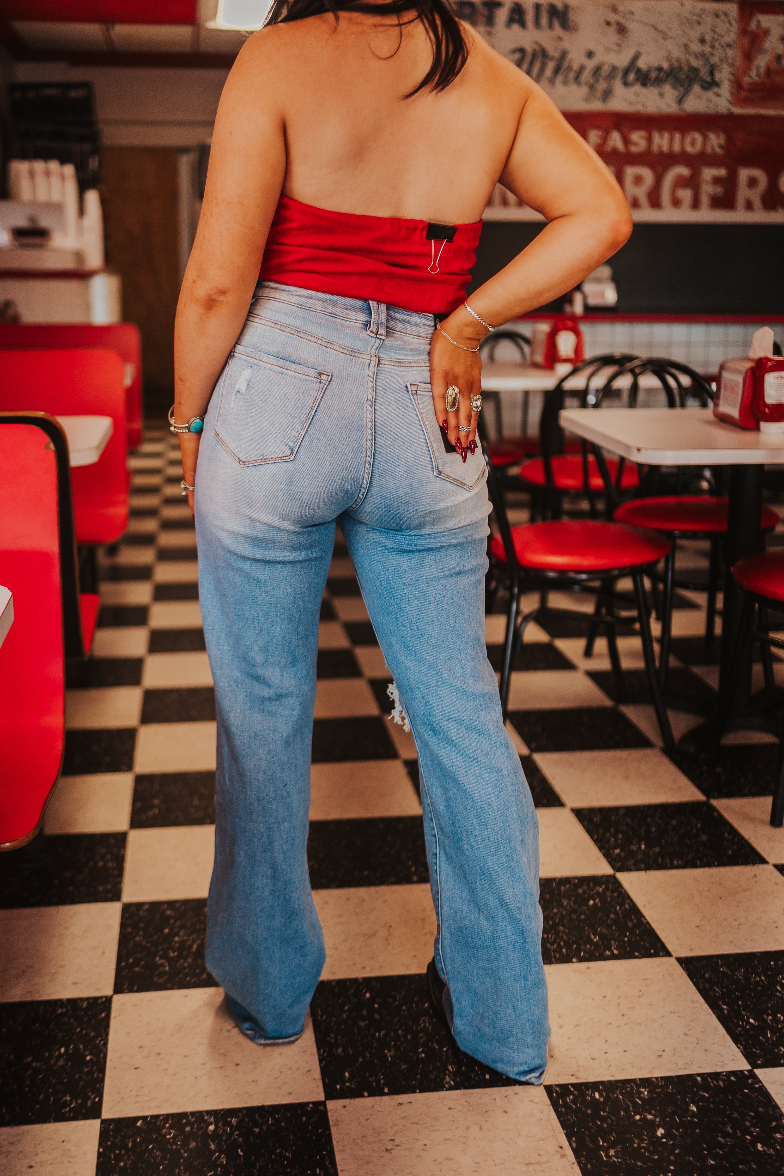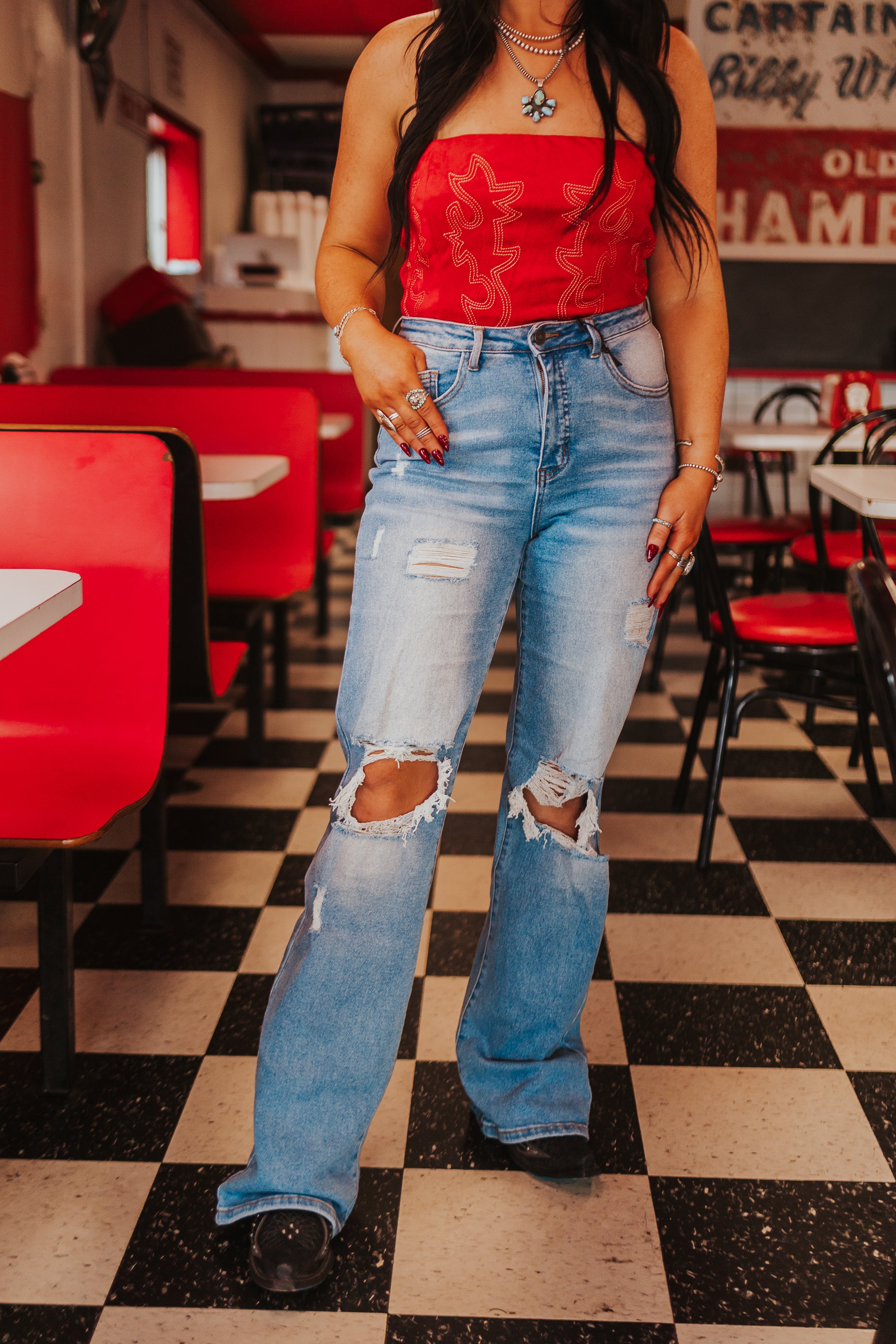 Turn heads with these bold and edgy L&B bootcut jeans, featuring a light wash finish, heavy distressing, and statement-making knee blowouts. The high-rise fit hugs in all the right places, while the flared leg adds that perfect touch of vintage Western flair. Pair them with boots or heels for a look that’s effortlessly cool and ready for anything.