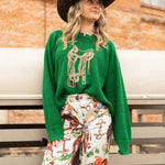 Cozy up Western-style in the Saddle Straps Knit Pullover — a bold Kelly green sweater with stitched saddle artwork front and center. This chunky knit has just enough stretch to move with you, and the slightly oversized fit gives it that effortless, borrowed-from-the-bunkhouse vibe.