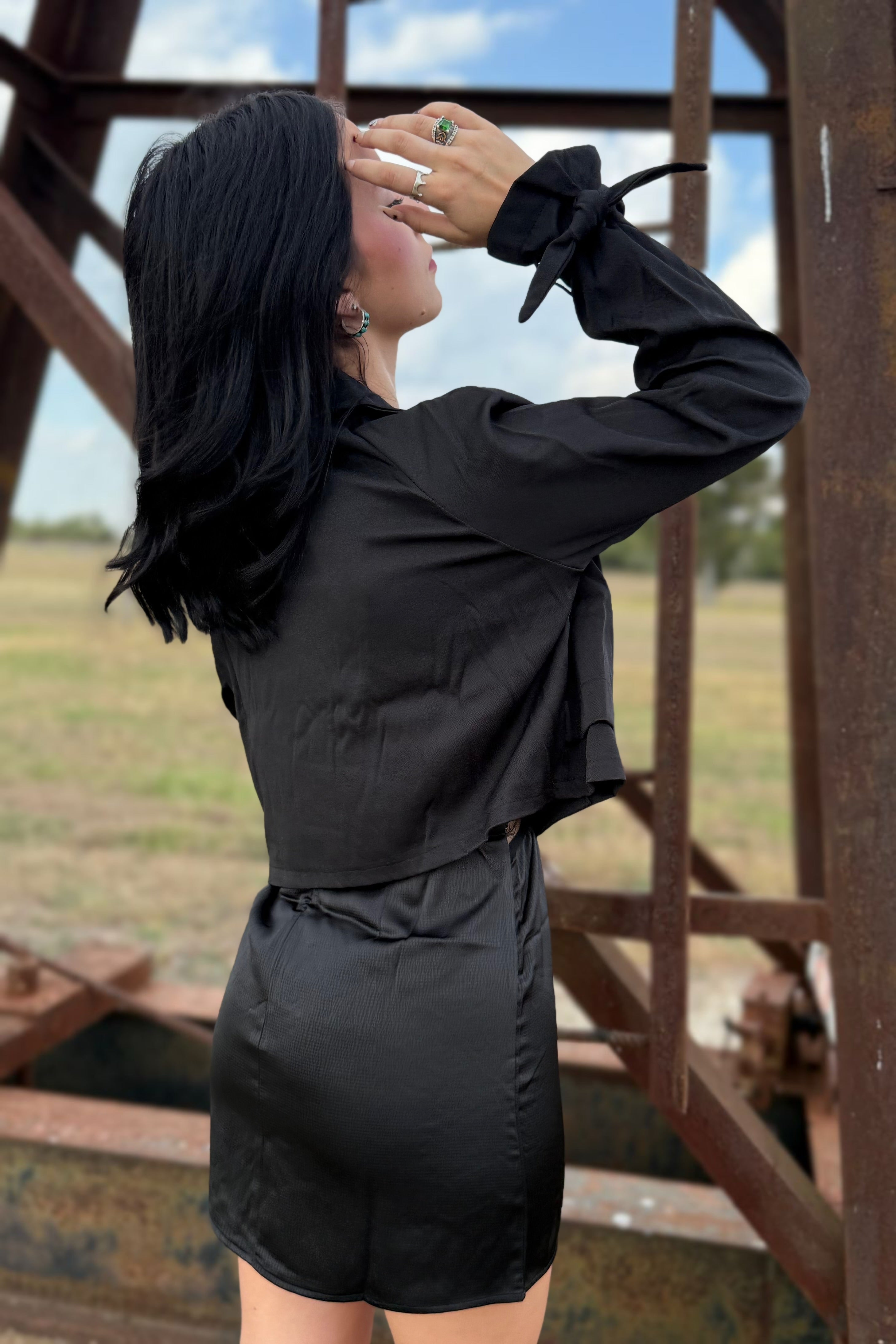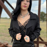 Power move, but make it Western. The Board Room Cropped Trench Jacket takes a classic silhouette and sharpens it with a modern, cropped edge. Featuring notched lapels, tie-cuff sleeves, and a boxy cut, this jacket is tailored for the women who run things — from the boardroom to the boomtown. Its lightweight yet structured feel makes it easy to style over dresses, lace maxis, or your favorite high-rise denim.