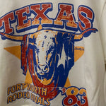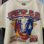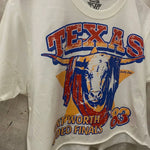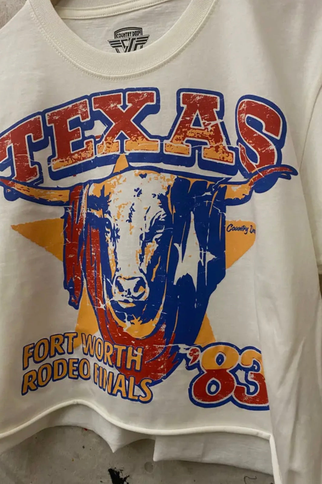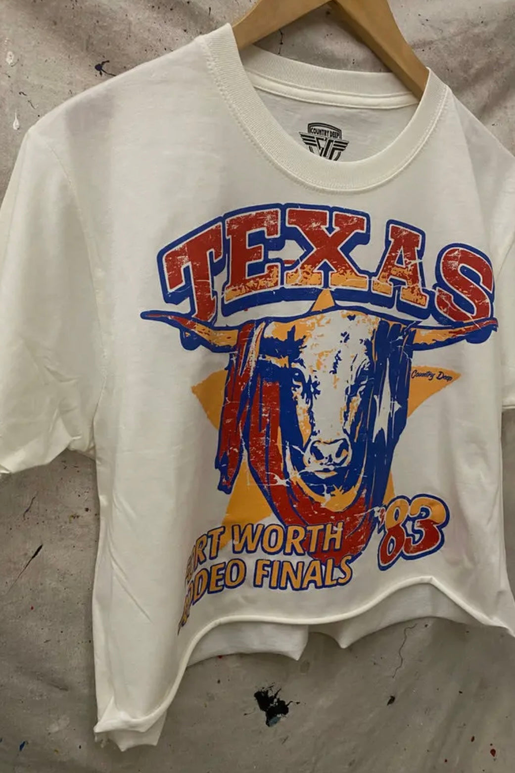 Step back into the grit and glory of Texas rodeo history with the Fort Worth Rodeo Finals ’83 Tee. This vintage-inspired graphic features a bold longhorn design over a golden Texas star, with distressed red and blue lettering that captures the look of a true retro souvenir. Crafted from 100% Airlume combed and ring-spun cotton, this cropped tee has a relaxed fit, finished hem, and neck binding for everyday wear. Perfect for pairing with high-waisted denim, boots, and your favorite rodeo jewelry, this shirt is a nod to the legends of the arena and a must-have for any Western wardrobe.