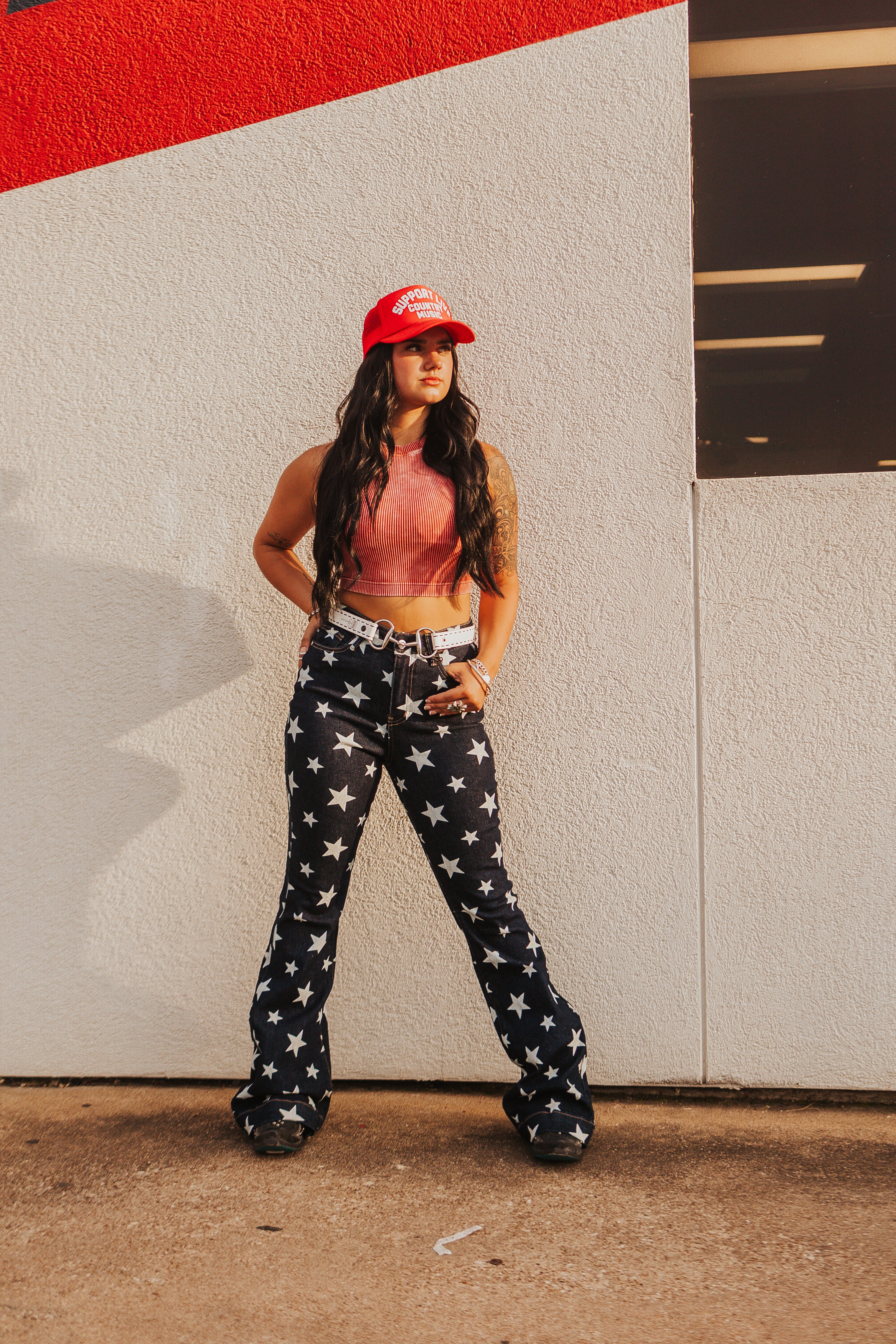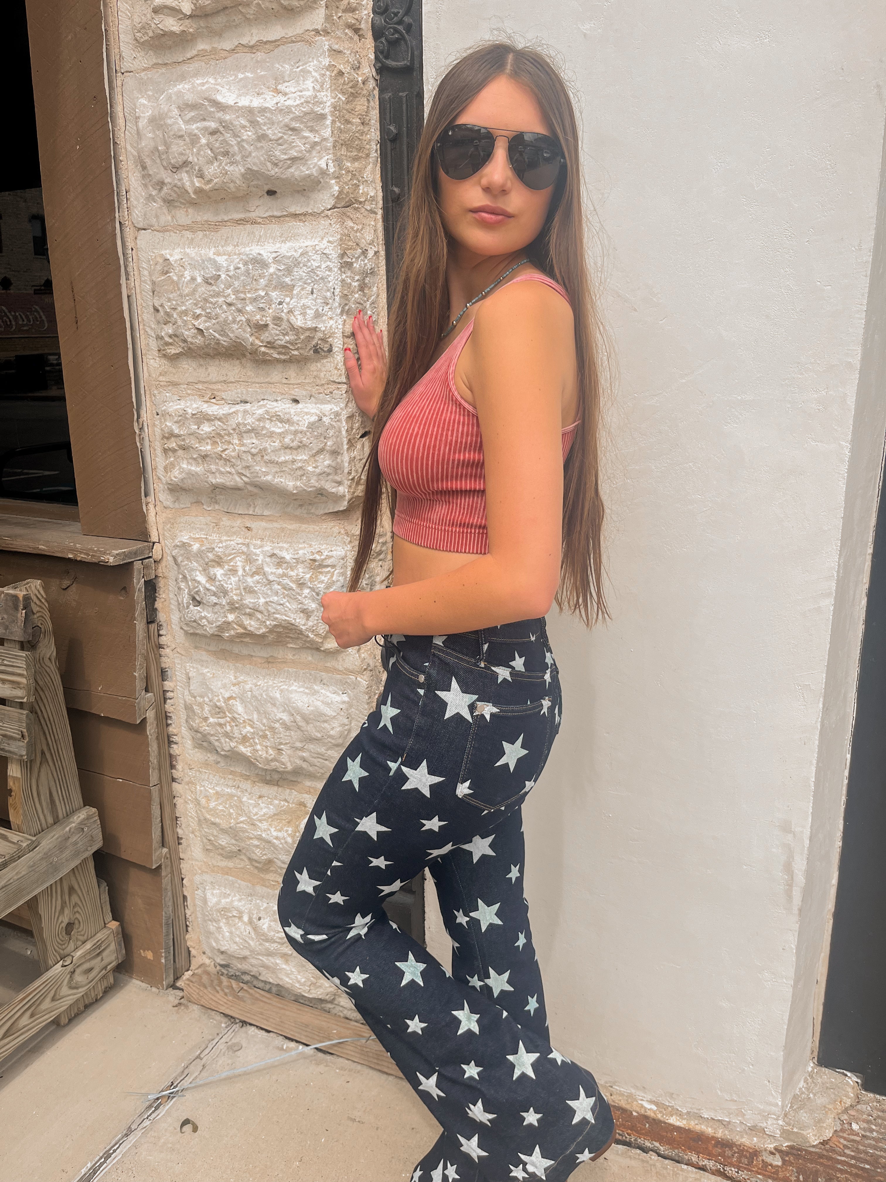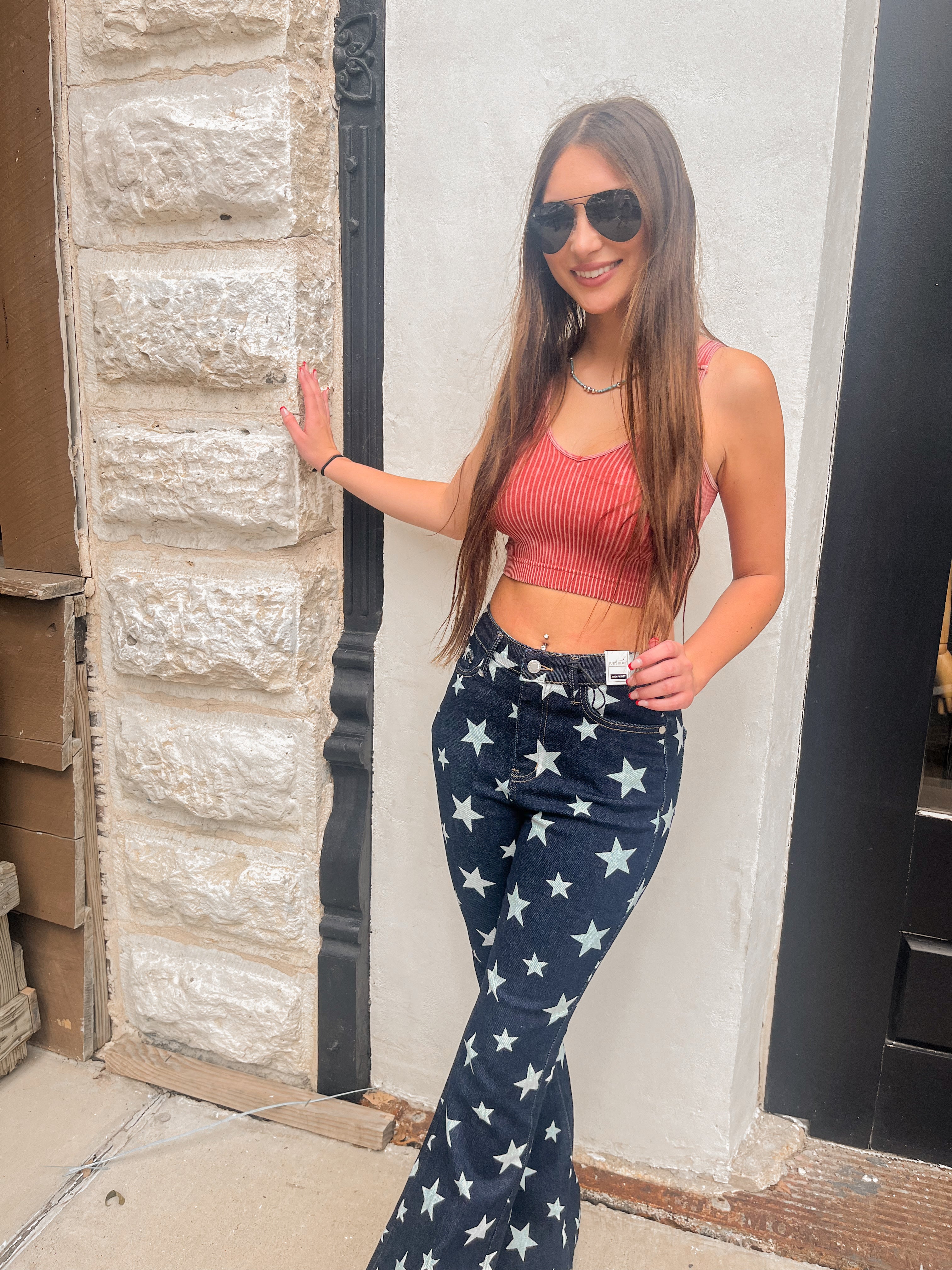 Show off your star power in these Judy Blue Mini Flare Jeans, made for the bold, all-American woman. Covered in playful stars and designed with a flattering high-rise fit, these jeans are your go-to for Fourth of July, Memorial Day—or any day you want to turn heads.