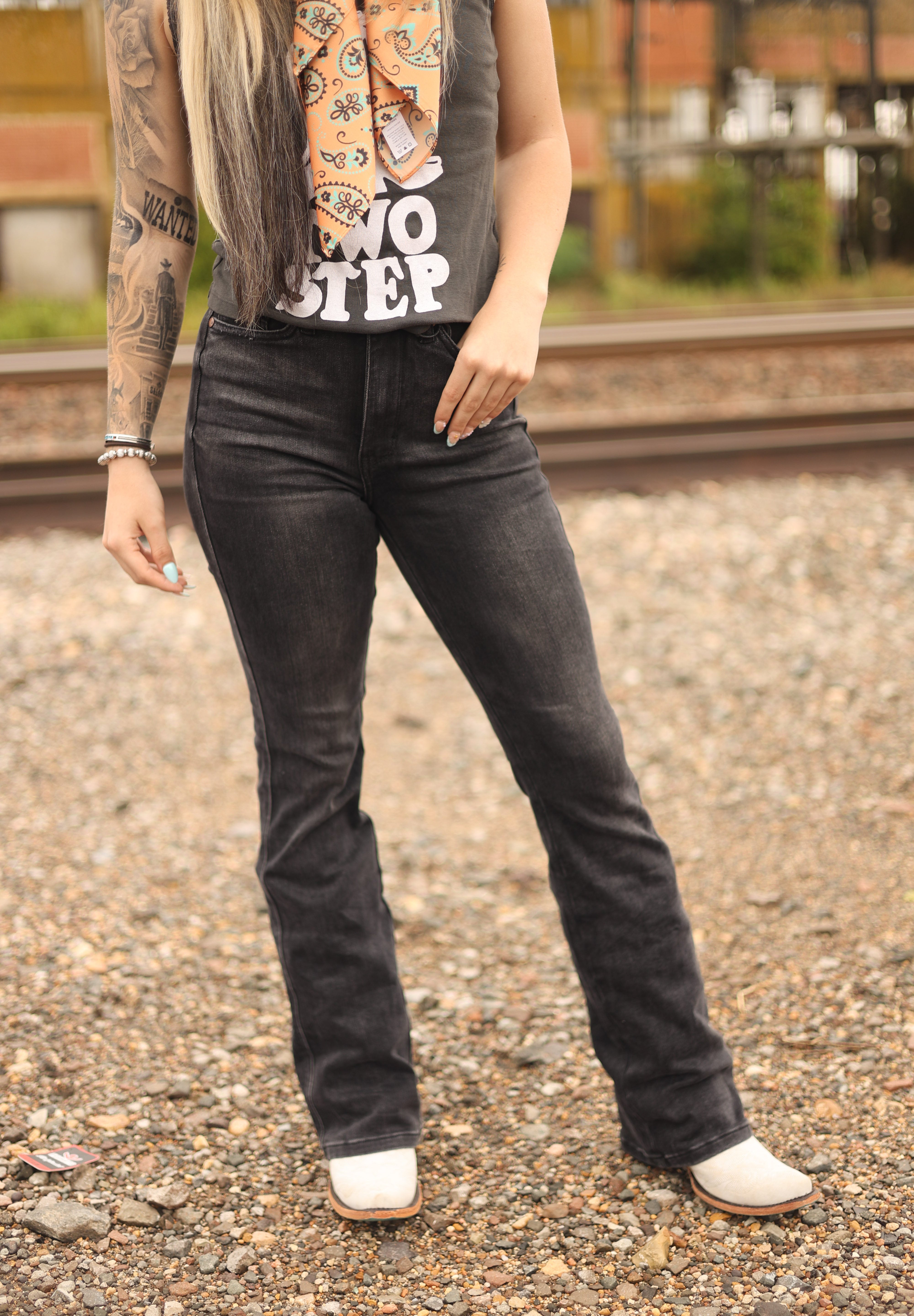 These black Judy Blue bootcut jeans are a Western wardrobe staple. With signature bootcut flair and subtle Western-inspired stitching on the back pockets, they blend classic style with a little country edge. Super stretchy, ultra-flattering, and ready to pair with everything from boots to graphic tees.