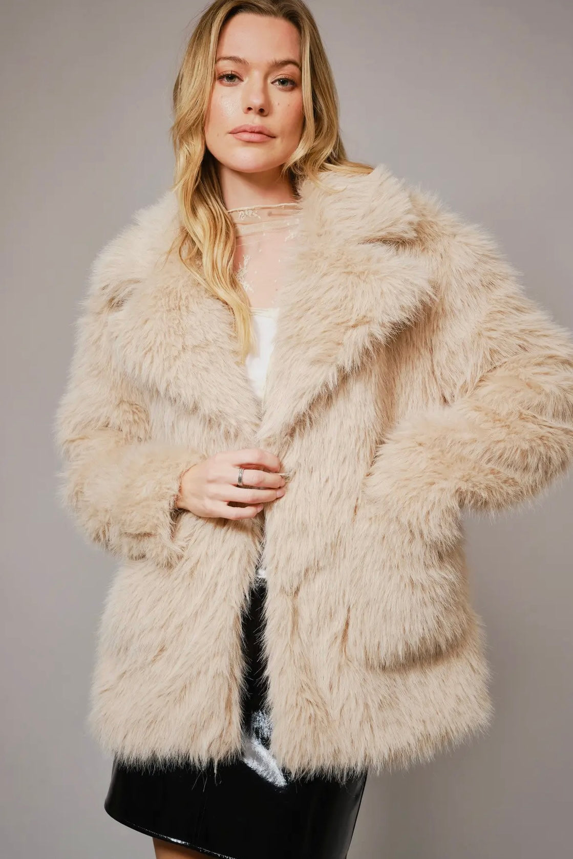 The light taupe hue whispers wealth while the bold, shaggy finish screams chaos. Toss it over a leather mini, a sequined slip, or nothing but attitude — either way, you’ll look like you belong to the night.