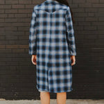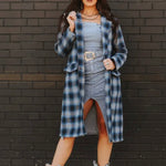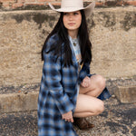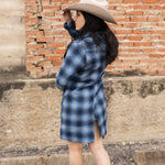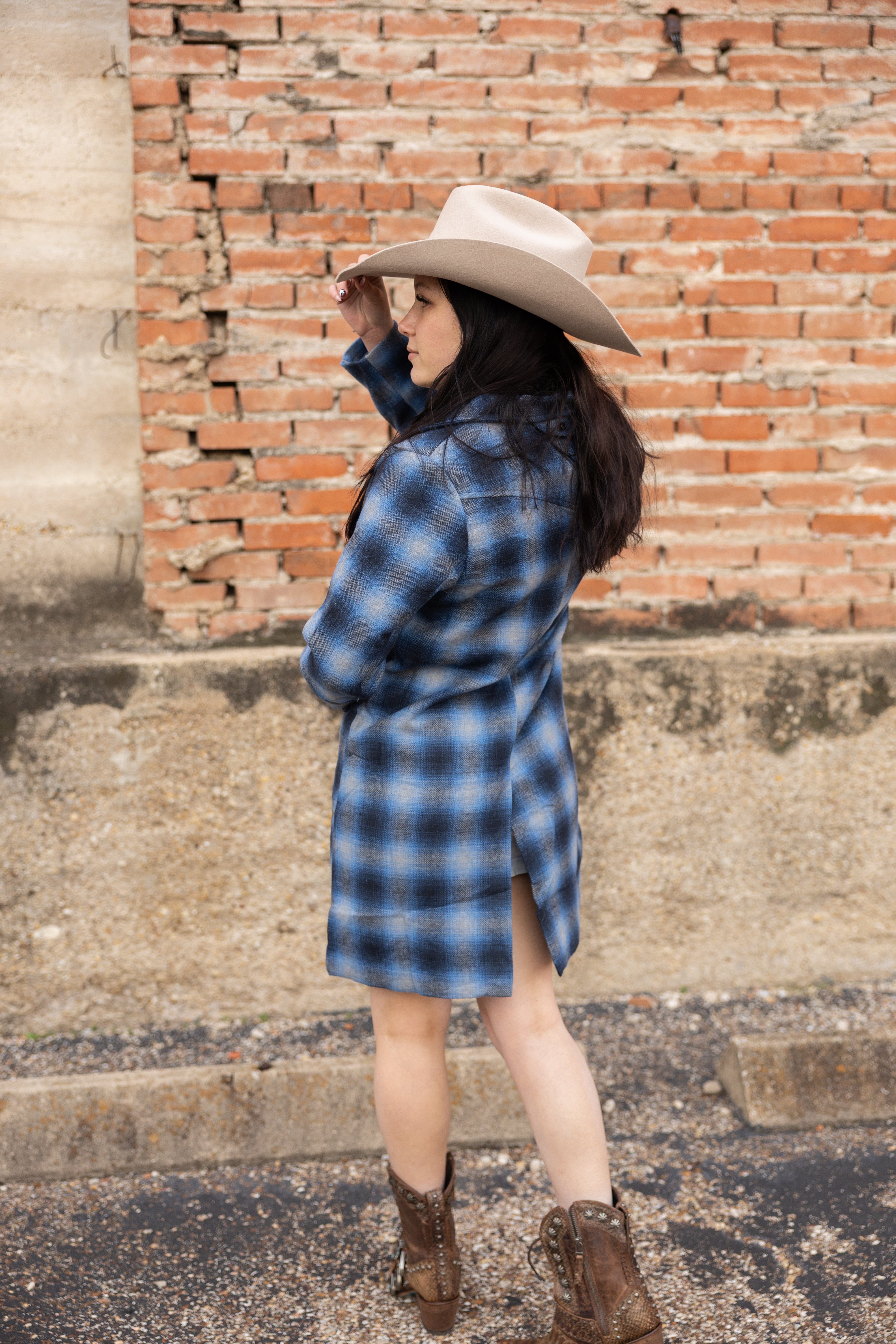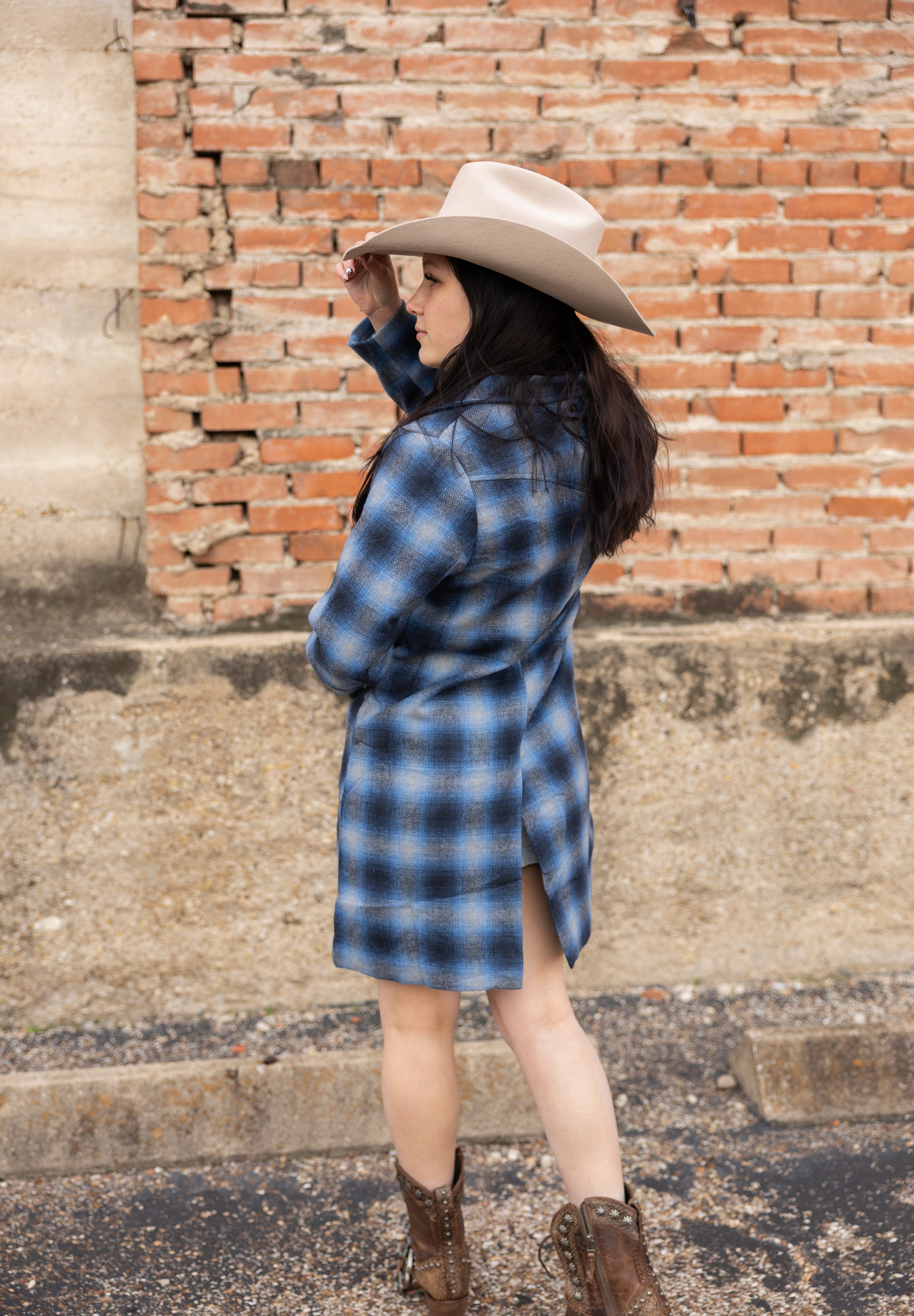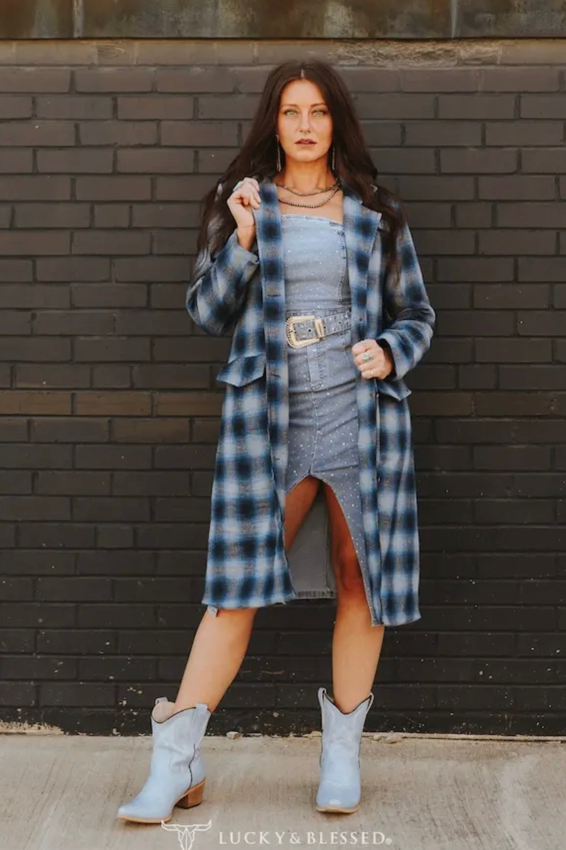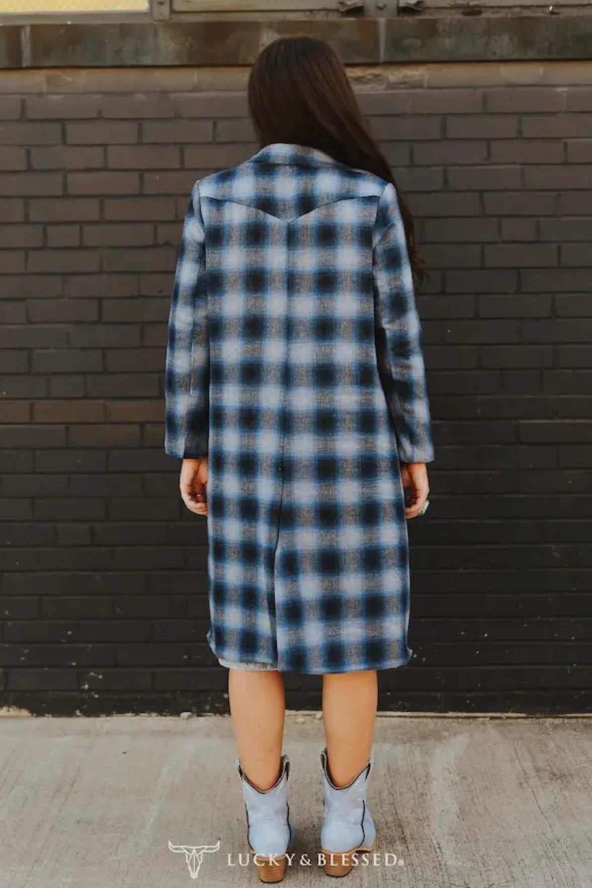 Wrap yourself in Western winter style with the Frosted Plains Duster. This longline plaid coat, designed in cool shades of blue and black, blends rugged ranchwear with a polished silhouette. Featuring a button-down front, notched lapel collar, and functional side pockets, it’s as practical as it is striking. The tailored fit and yoke detailing add Western edge, while the warm wool-blend feel makes it perfect for crisp mornings, rodeo nights, and holiday outings. Layer it over denim and boots for a cozy ranch look, or style it with a dress for a bold winter statement. Available in sizes Small through 3XL.