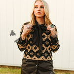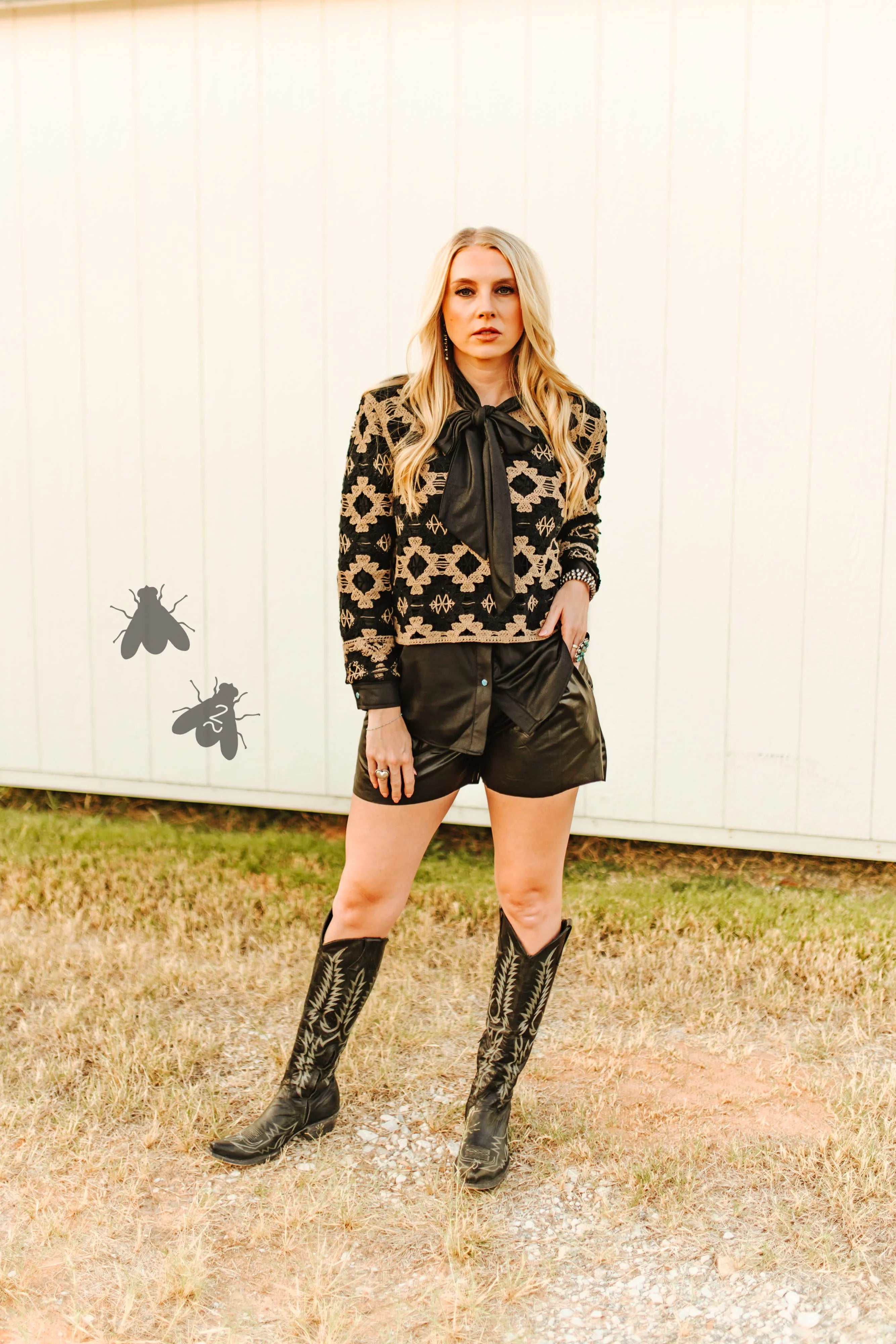 Meet the Desert Stitch Crochet Top — a luxe blend of Western edge and feminine detail. Featuring a tan and black Aztec-inspired crochet overlay, this piece feels vintage yet modern, perfect for layering through every season.