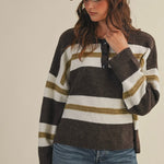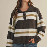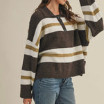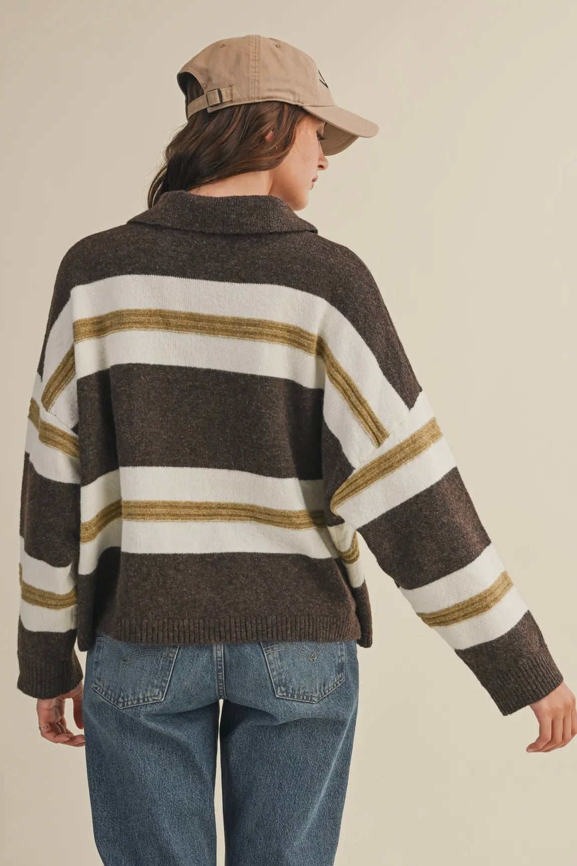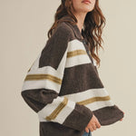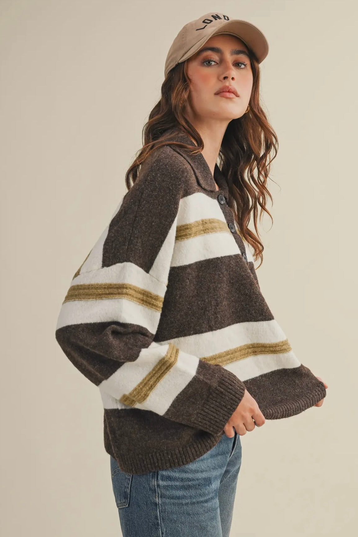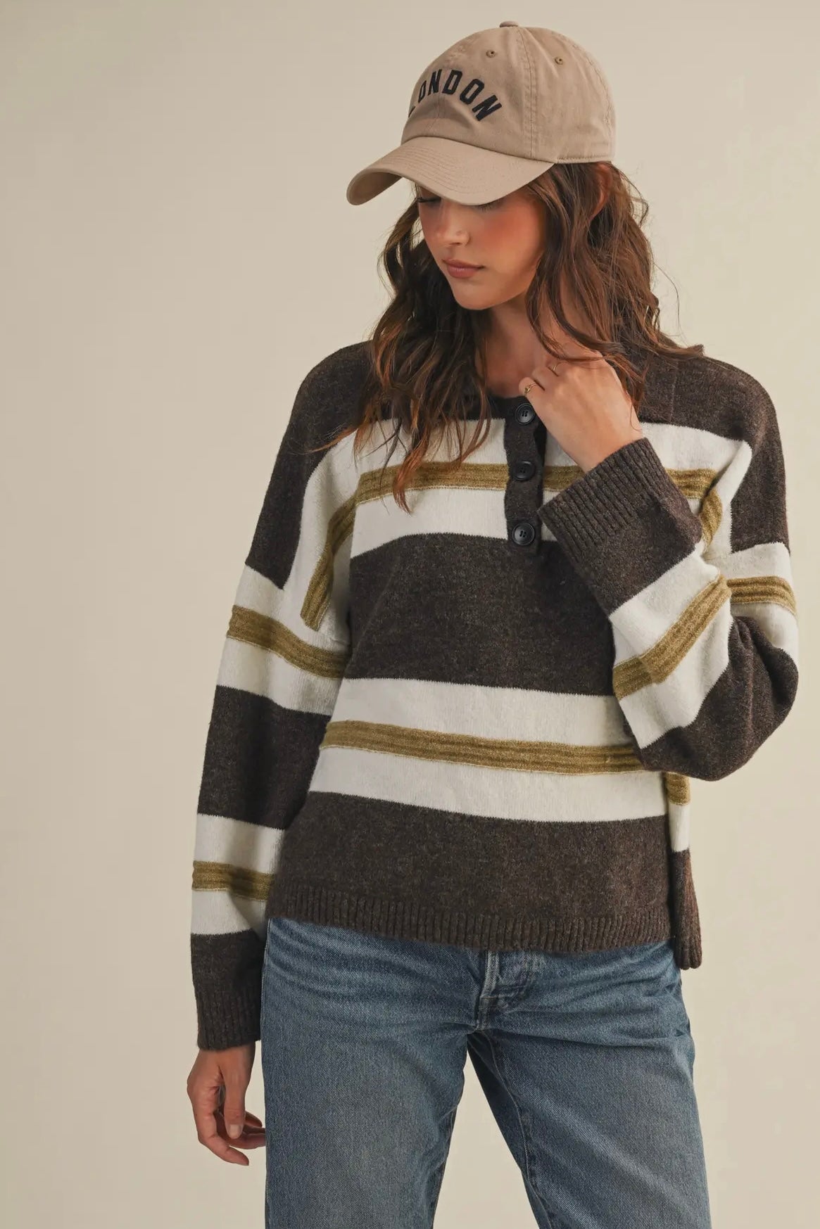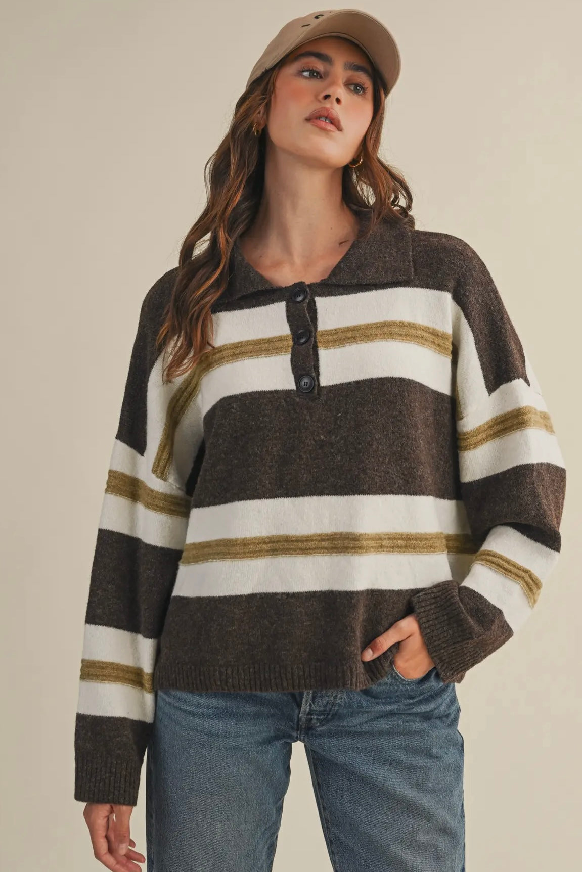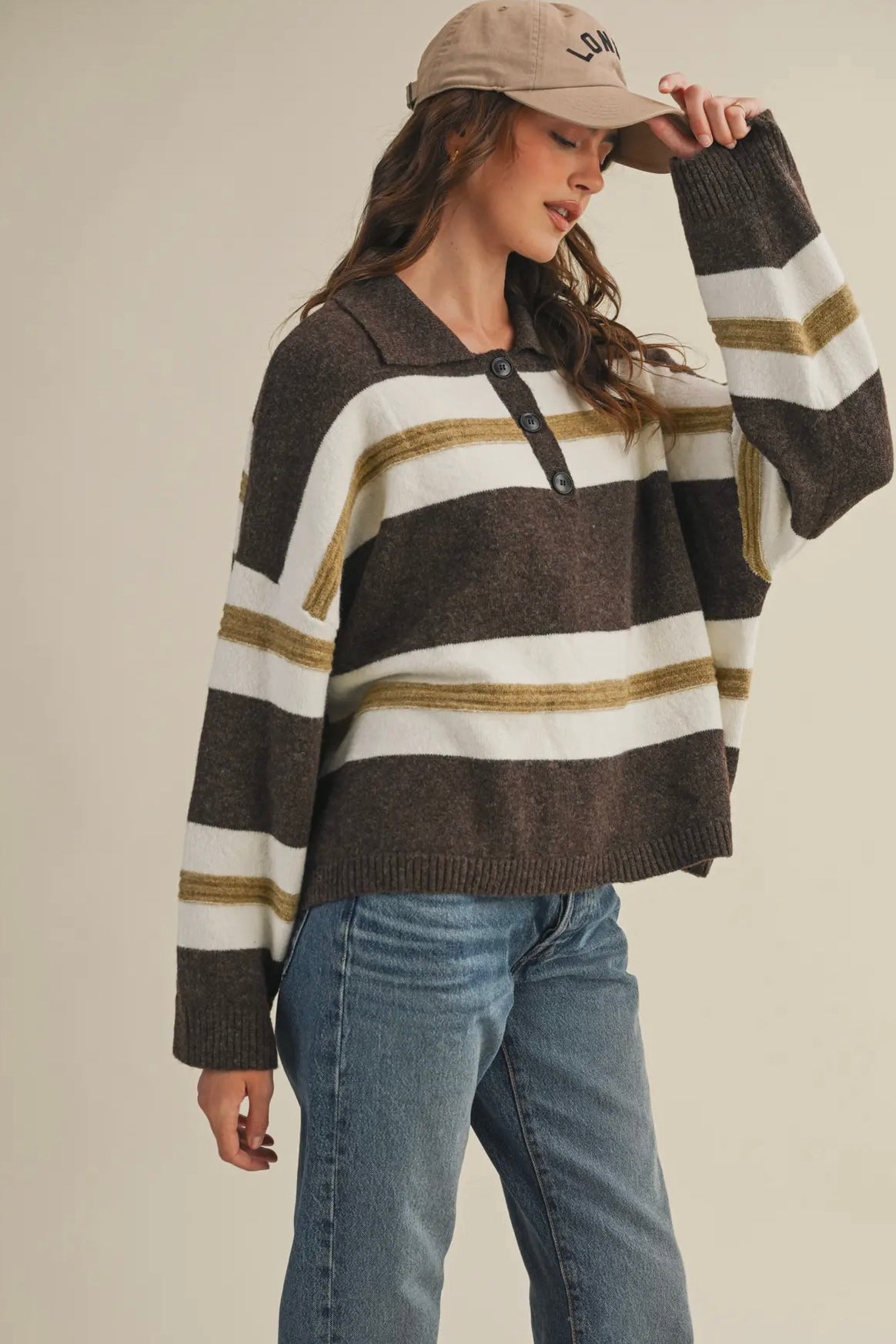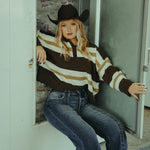Cozy up in effortless Western-chic style with our Ranch Rugby Striped Sweater. Featuring bold cream and mustard stripes on a deep chocolate base, this slouchy pullover combines the classic rugby look with an easygoing fit. The collared neckline with a three-button placket adds a touch of structure, while drop shoulders and ribbed trim keep it relaxed. Soft and warm for crisp fall mornings or layered winter days, this sweater pairs perfectly with your favorite denim and boots.