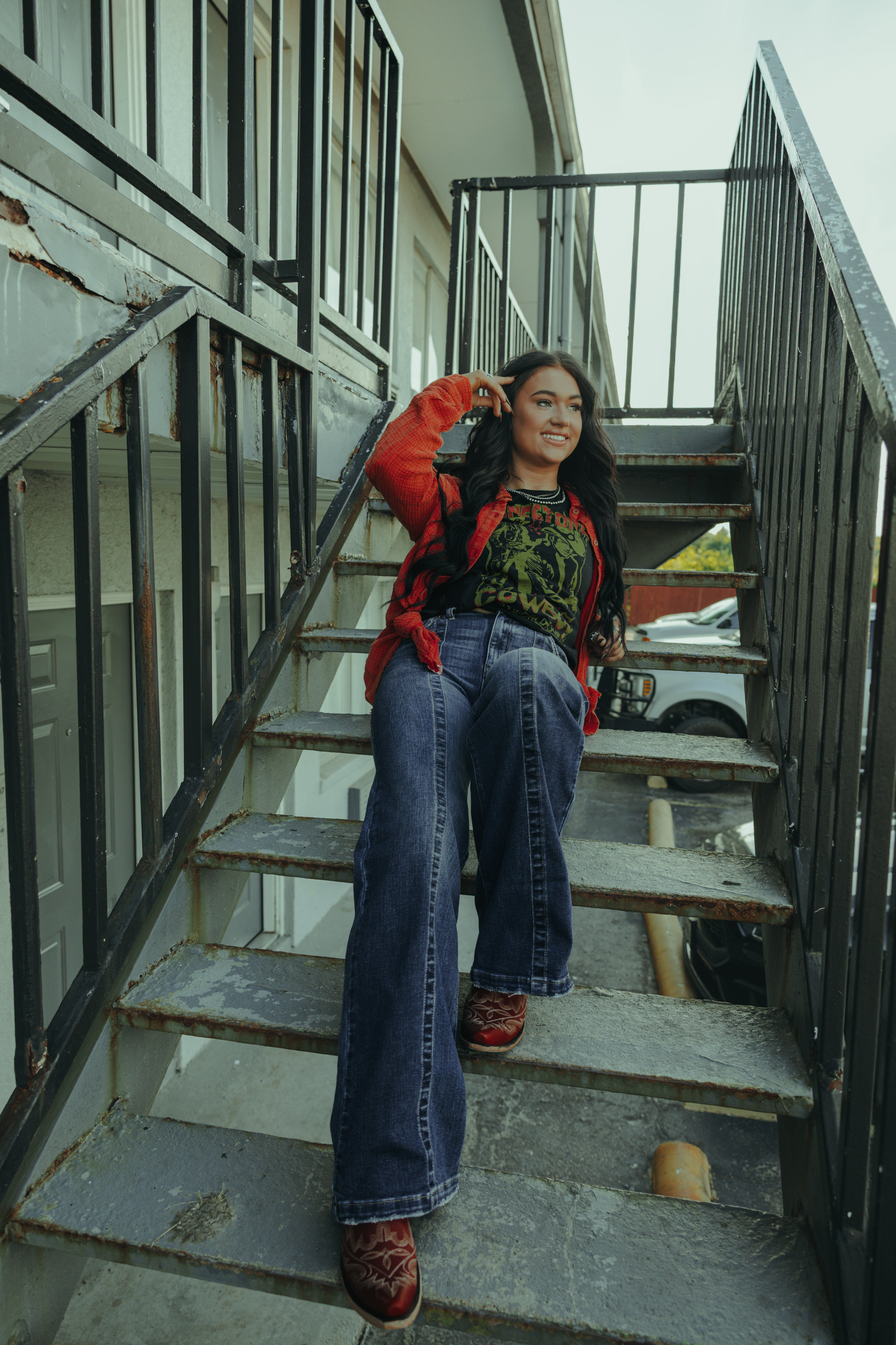 Structure meets soul in the Freightline Jean. These ultra-high-rise wide legs are designed to sculpt and smooth with hidden tummy control and a flattering front seam detail. The medium stone wash and exposed buttons bring just enough grit, while the eco-conscious stretch denim moves with you from morning coffee runs to late-night jukebox twirls. They’re clean, confident, and ready to go wherever fall takes you.