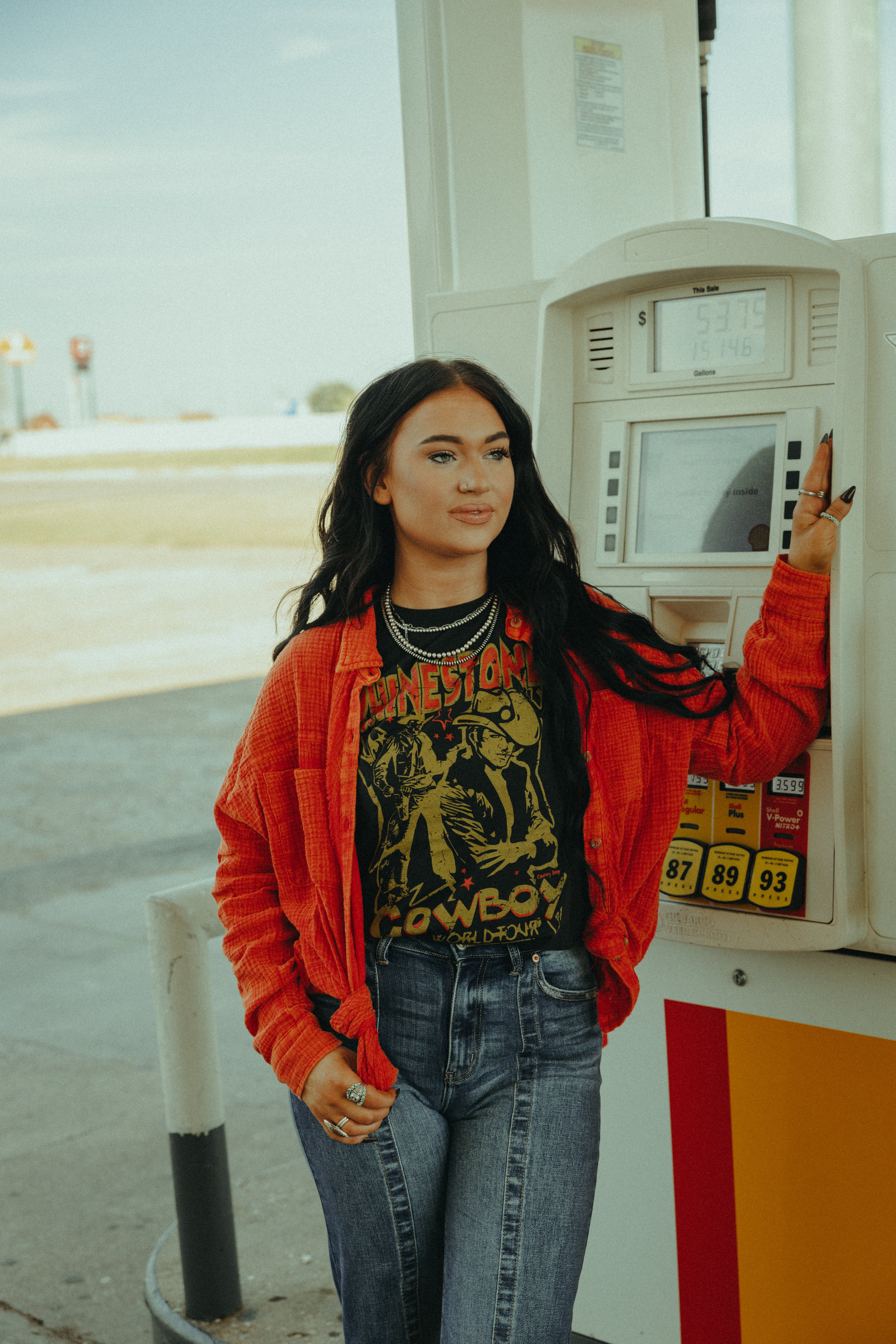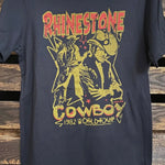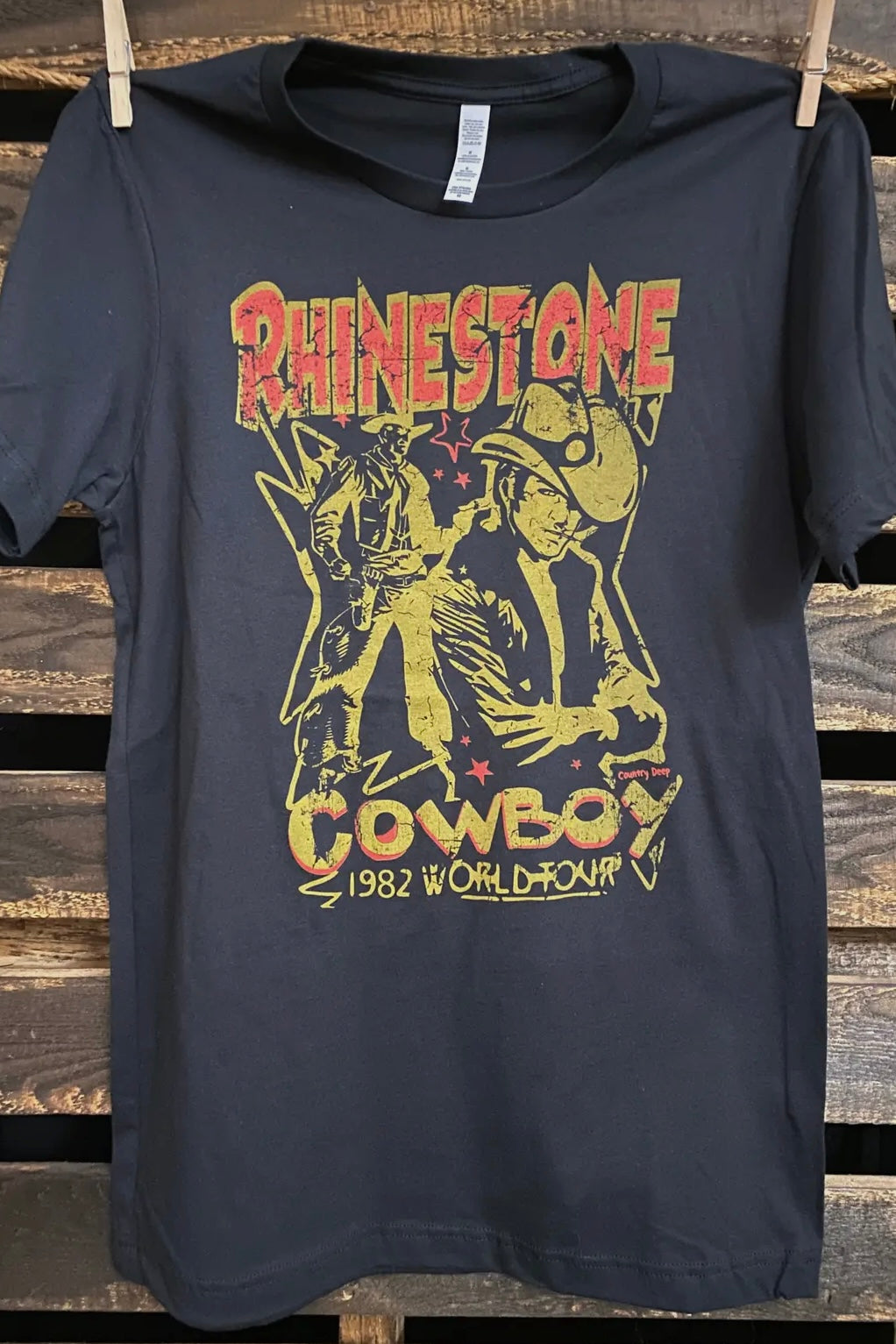 A little bit honky tonk, a little bit hair metal — the Rhinestone Cowboy World Tour Tee brings 1982 rodeo chaos to your closet. With a distressed, vintage-inspired graphic that looks straight off a concert tee, this soft black unisex tee is built for two-steppin’, whiskey sippin’, and late-night jukebox singalongs. Rock it oversized with boots or knotted over cutoffs — it’s country music outlaw energy, turned up loud.