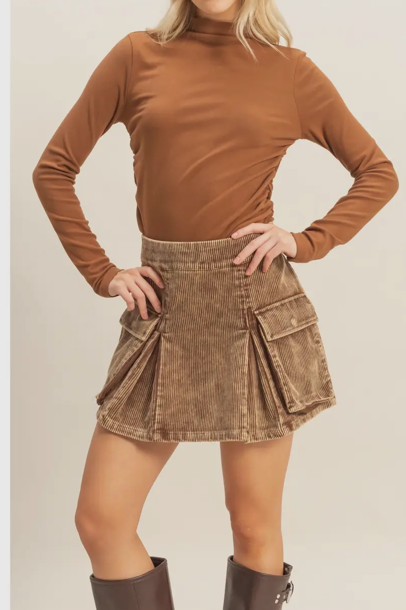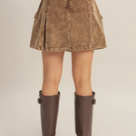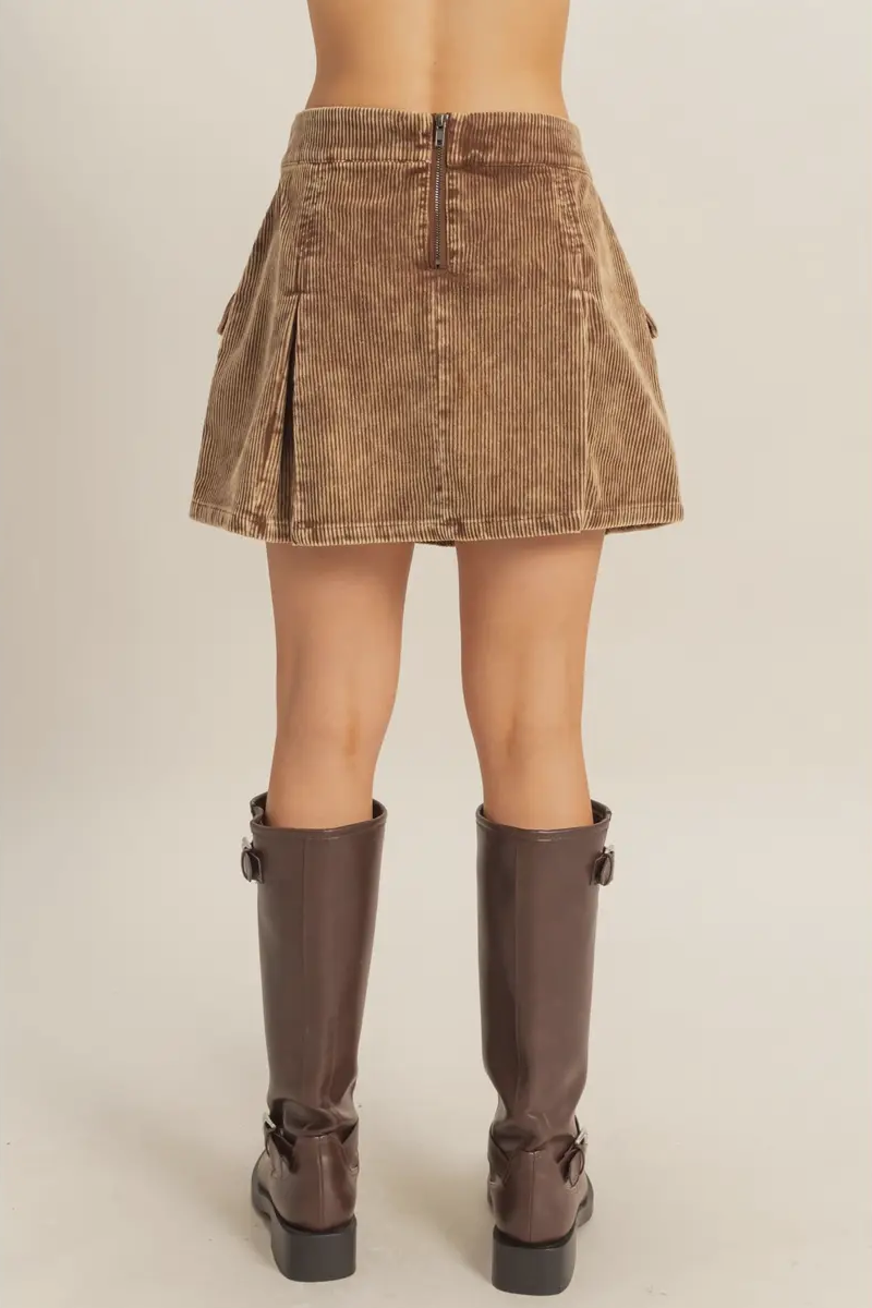 Bring rugged charm into your fall wardrobe with the Canyon Cord Cargo Skirt. Crafted from soft corduroy with a structured silhouette, this mini features bold cargo-style pockets and pleated detailing that give it a Western workwear edge. Its earthy brown tone makes it endlessly versatile — pair it with tall boots and a fitted top for a night out, or layer it with tights and a jacket for cooler days.