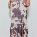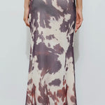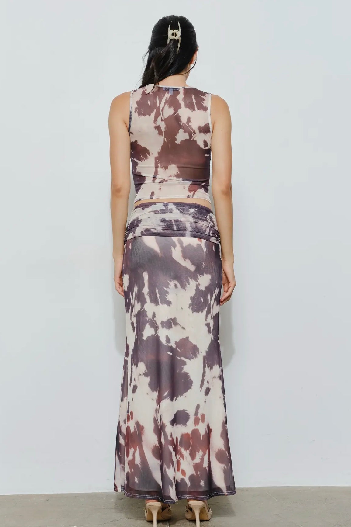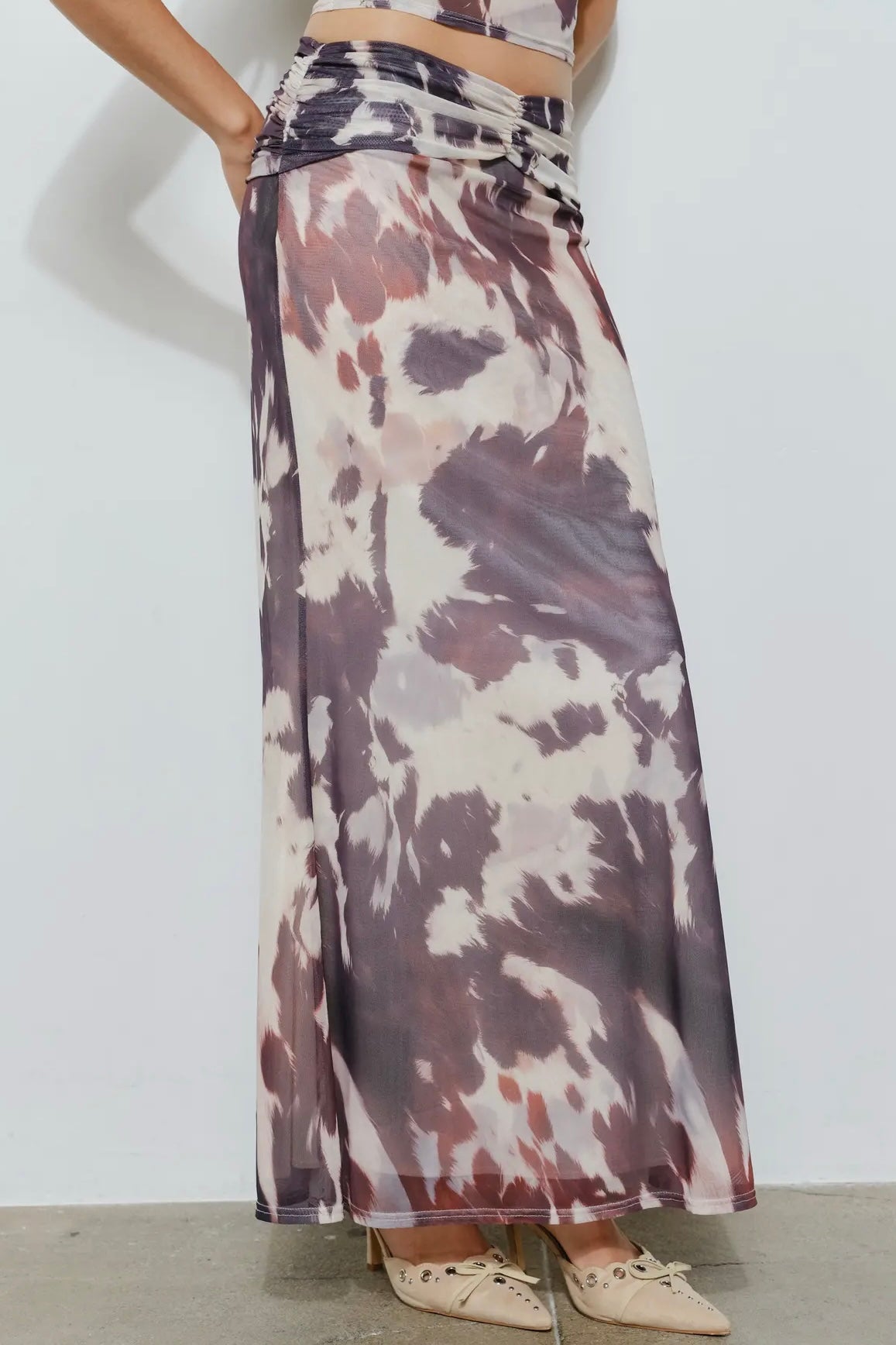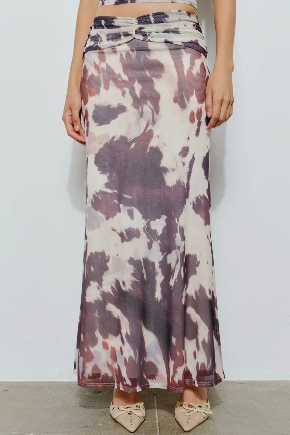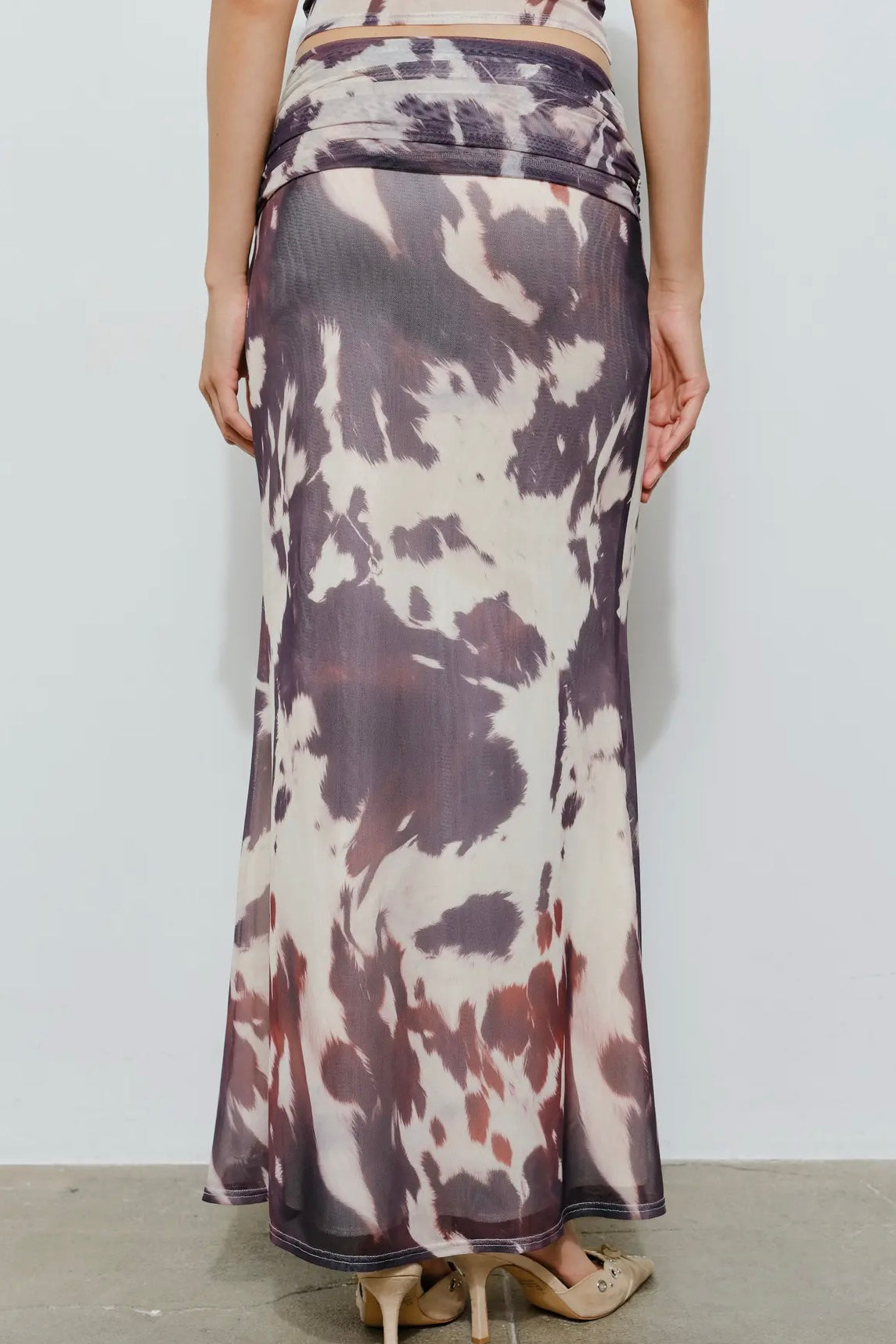The Cowgirl Mirage Skirt is Western-inspired glam at its finest. Designed in a cowhide-inspired mesh print, this longline skirt hugs in the right places with a soft, sheer finish and a lined interior for coverage. The ruched waistband detail flatters your shape while the flowy hem gives it easy movement — perfect for nights out, rodeo weekends, or dancing under neon lights.