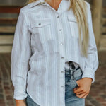 timeless Western classic with a modern edge. The Ivory Striped Pearl Snap Shirt brings subtle texture with soft vertical striping, polished pearl snap closures, and traditional yoke detailing. Dual chest pockets add function while the crisp ivory hue keeps it versatile for every season. Pair it with denim and turquoise for rodeo nights, or keep it simple and polished for everyday ranch life. Durable yet refined, this is a true cowgirl essential you’ll reach for again and again.