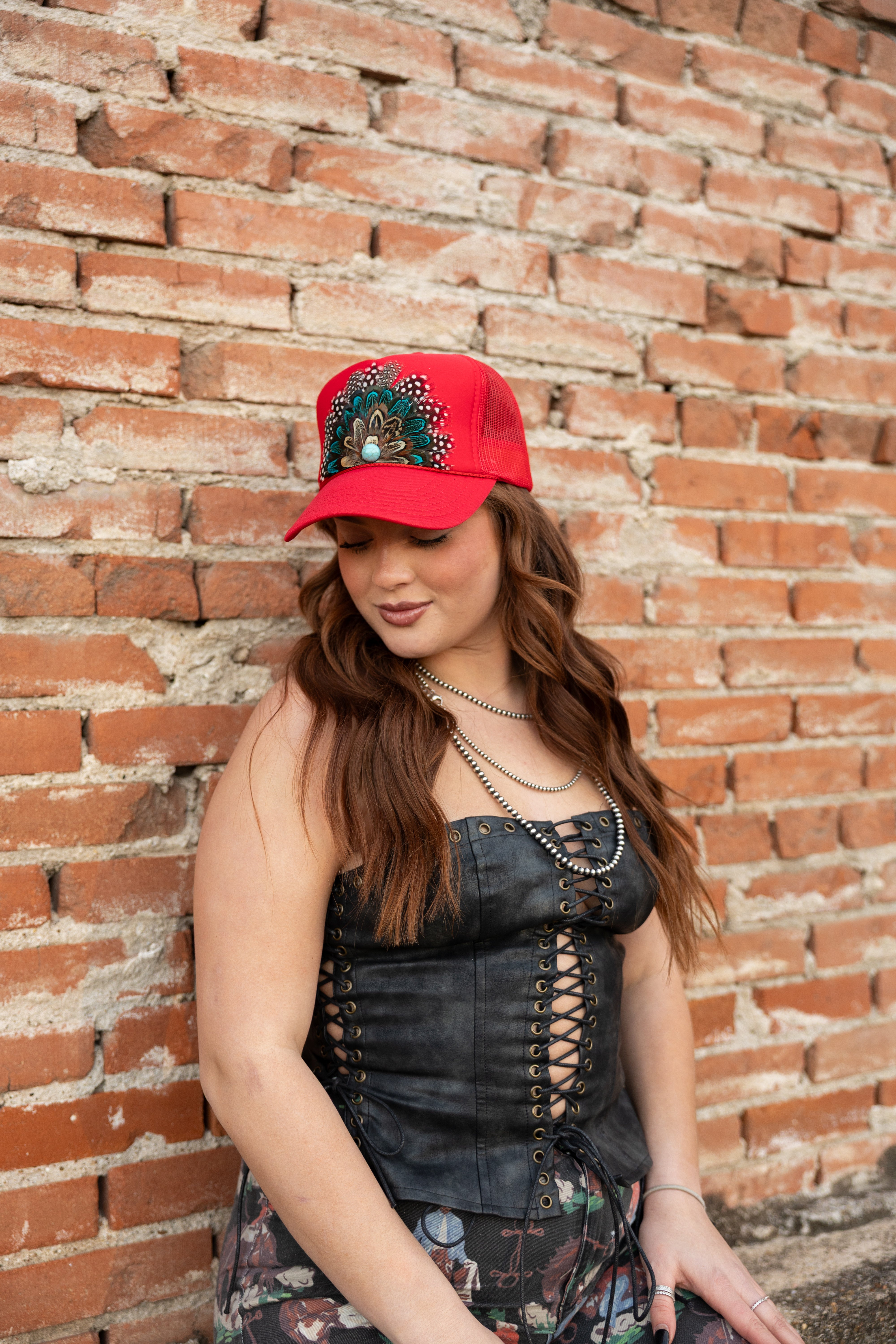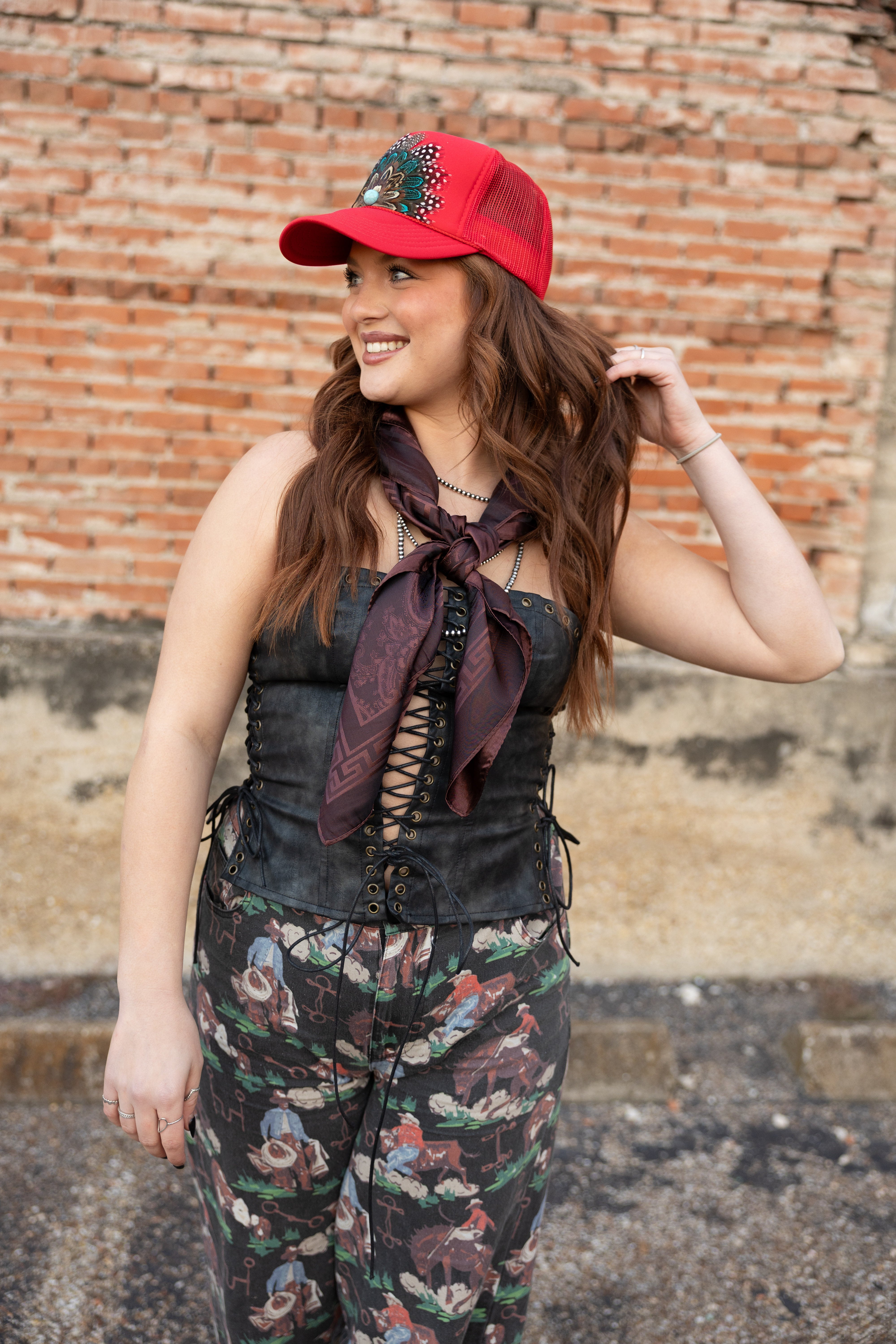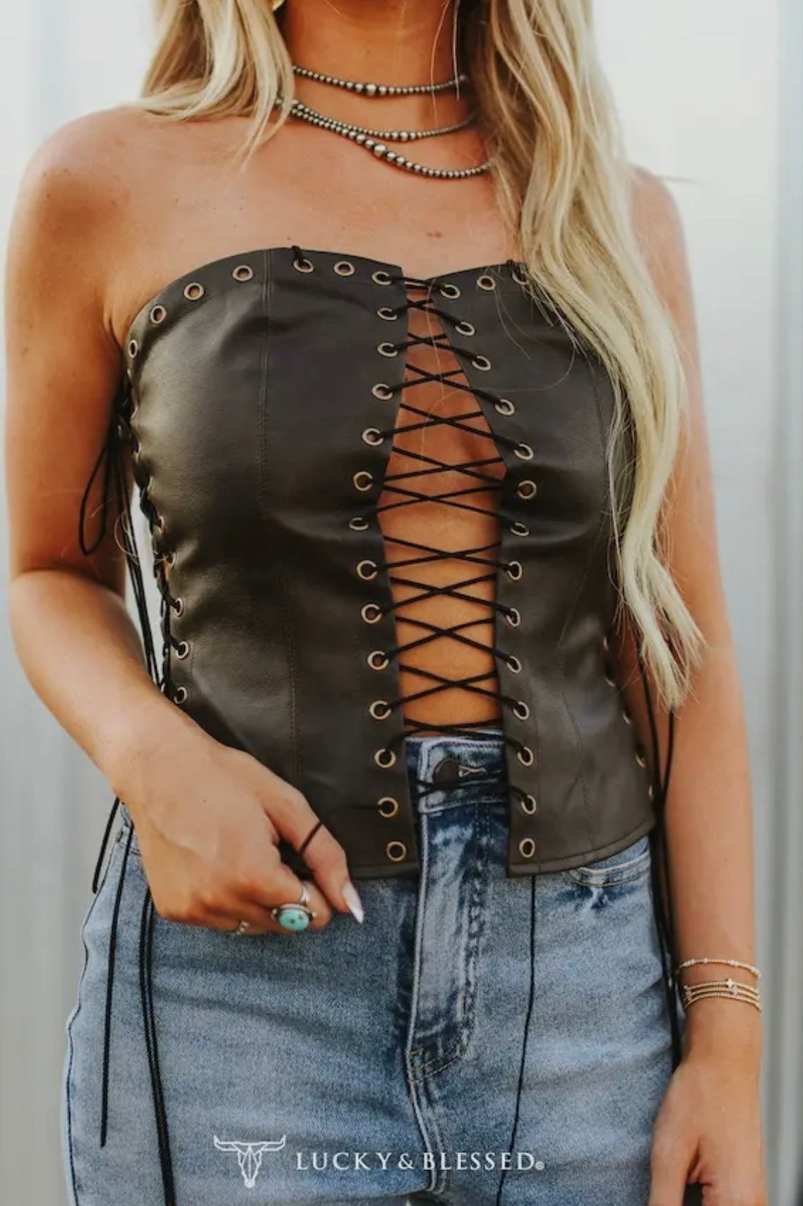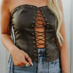 Bring bold Western glam to the spotlight with the Whiskey Nights Corset. Crafted from dark faux leather with a strapless silhouette, this showstopping top features bronze grommets and lace-up ties down the front and sides for a daring, adjustable fit. The structured bodice shapes and flatters, making it perfect for rodeo nights, concerts, or a wild night out. Pair it with high-rise denim for a fearless look, or layer it with fringe and turquoise to turn heads in true outlaw style. Rugged, sultry, and unforgettable—this corset is made for whiskey-fueled nights and cowgirl grit.